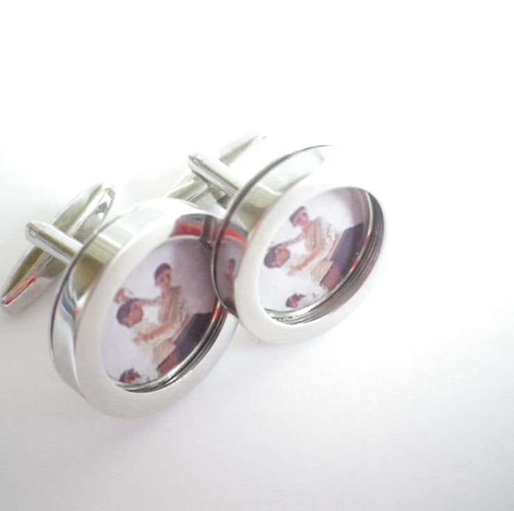 The cufflink sets have an even, smooth, highly polished silver finish, with a deep setting and a swivel action 'cigar' shaped shank for ease of use. Crafted from rhodium plated alloy the image has a 15mm ( 3/5" ) protective transparent film, with a neat presentation box..