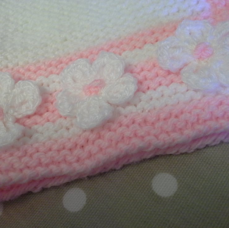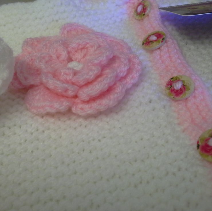 It has genuine wooden buttons with a delicate flower design on them. There are six white hand crocheted flowers on the bottom fronts with hand embroidered French knots in the centres with a large pink statement crocheted flower.