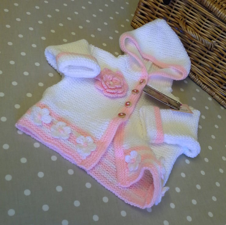 A very sweet eye catching baby girl's' long hooded cardigan/jacket ideal for everyday wear during chilly and cold days. It will be ideal for the car, buggy or as an extra cosy layer to keep baby warm doors. The garment has been designed and hand knitted using branded French manufactured yarns which are machine washable.