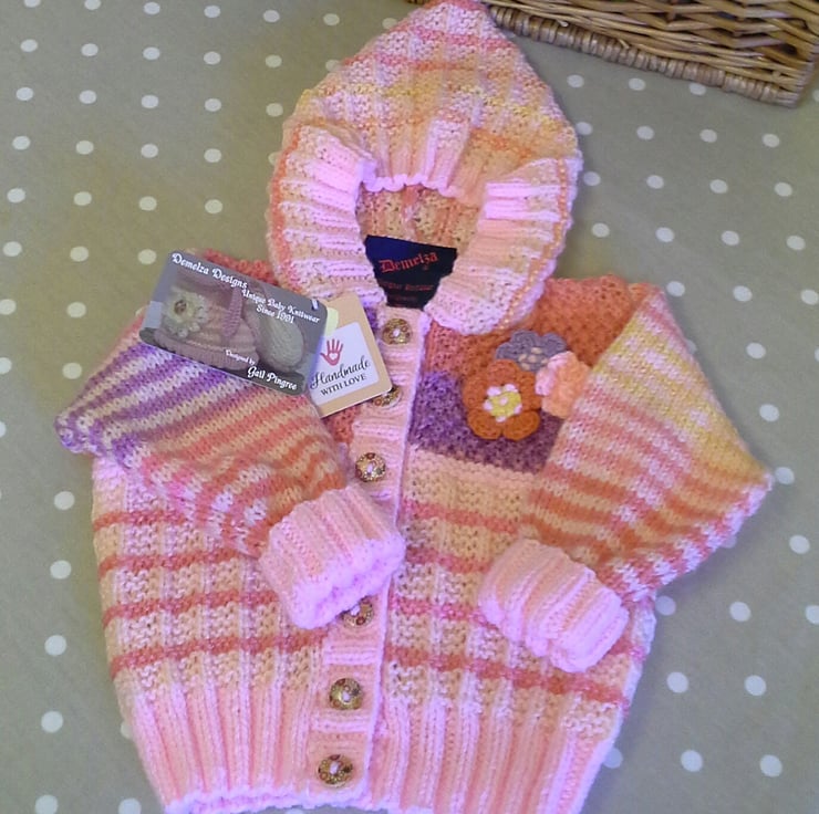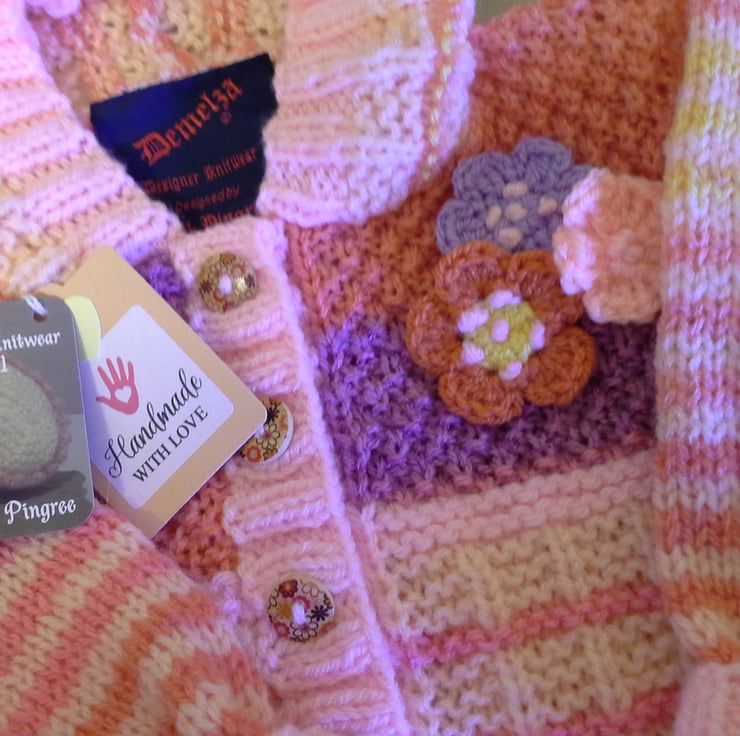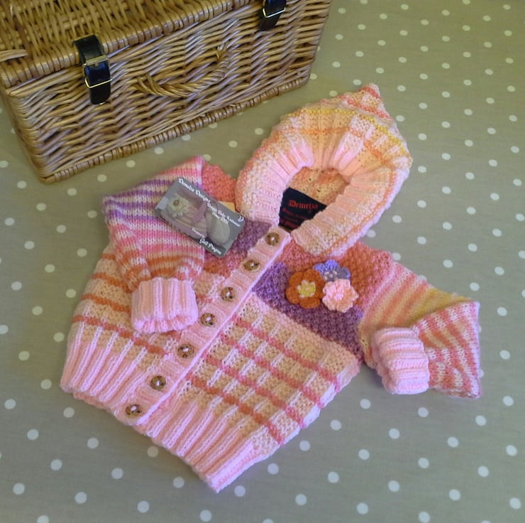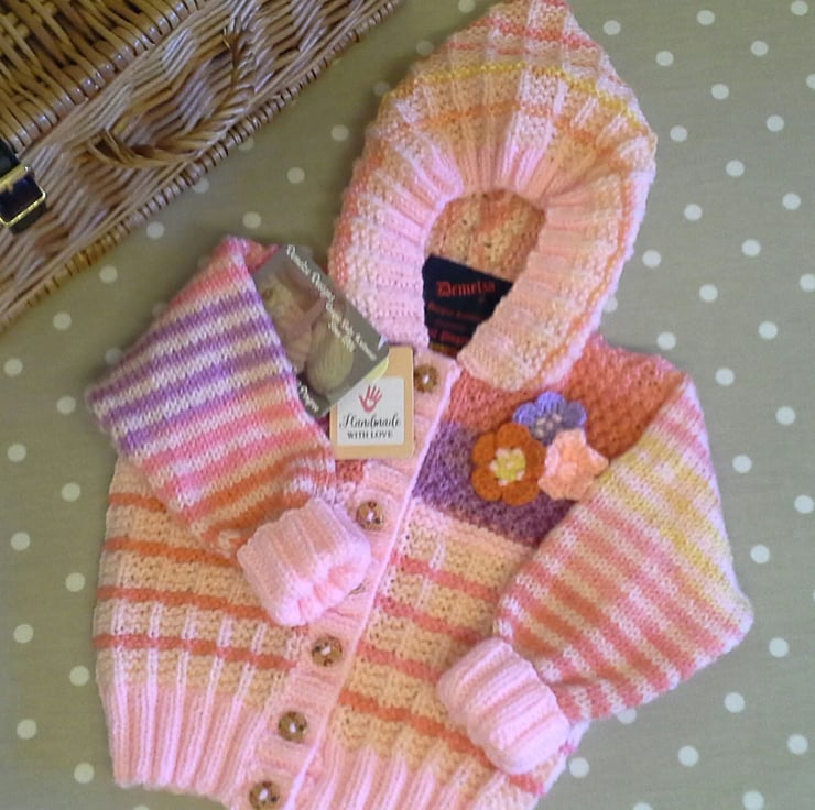 A very pretty unique baby girl's hooded cardigan/jacket designed and totally hand crafted using quality branded French and British machine washable manufactured premium yarns. The item has hand crotchet flowers which have been decoratively hand embroidered.