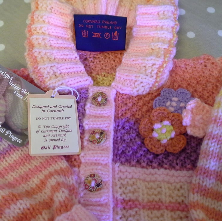 Baby knitwear is designed and hand crafted by Demelza Designs in Cornwall meeting UK baby safety standards, Only branded premuim acylic, acrylic/natural fibre blends or pure natural fibre yarns are used in baby knitwear which conforms to BS984/76 standards.