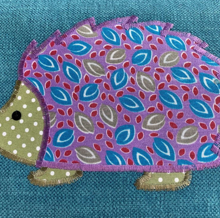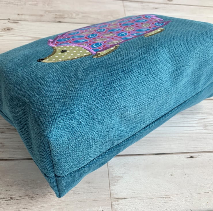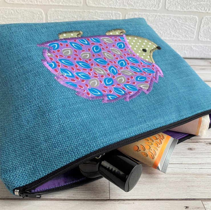 A cute hedgehog toiletry bag in turquoise fabric with a delightful appliqué hedgehog. The main body of the hedgehog is made from a pretty print fabric featuring leaf shaped motifs in turquoise, olive green and dark red on a purple background. The hedgehog’s head and feet are made from olive green fabric with white polka dots. I’ve added black sequins for the hedgehog’s eye and nose. The wash bag has a black zip and is fully lined with purple water-resistant fabric. The base of the bag is boxed to give lots of space for all those essential items.