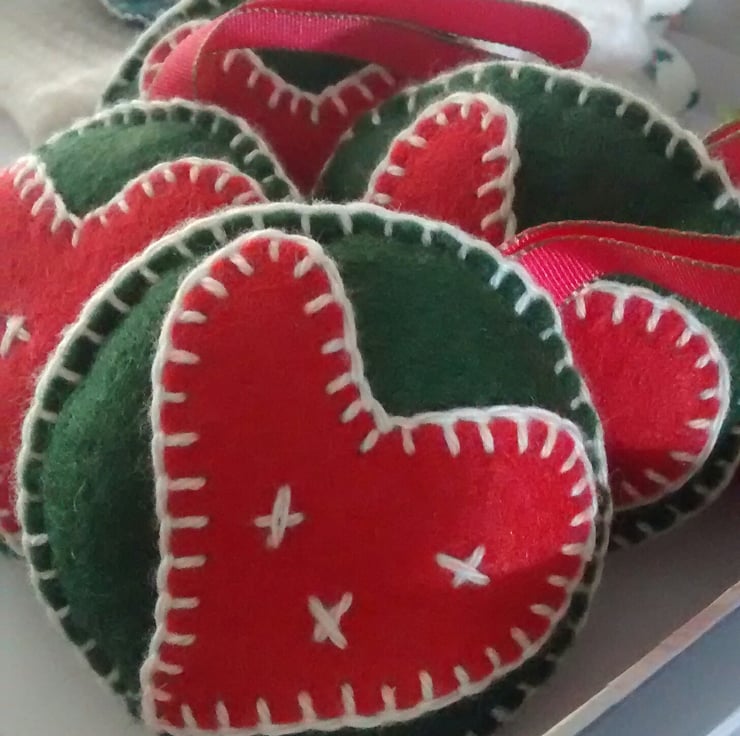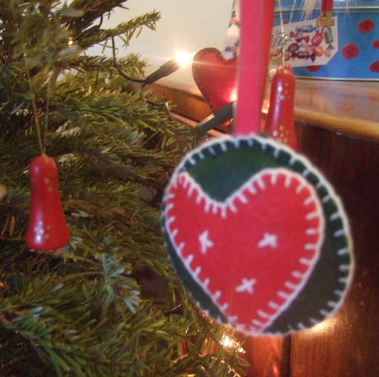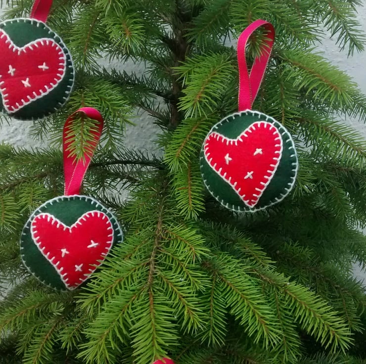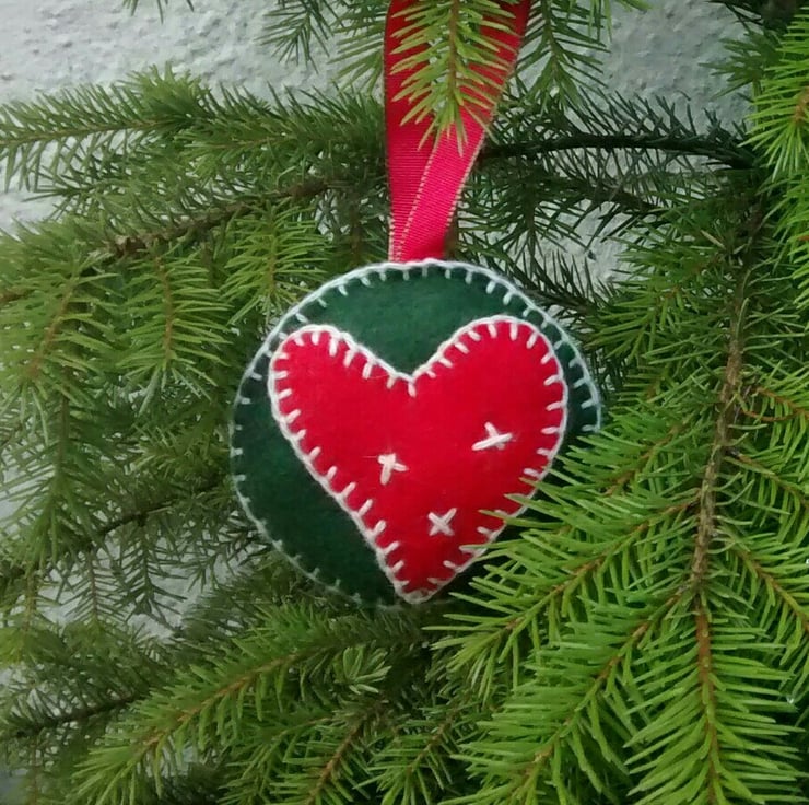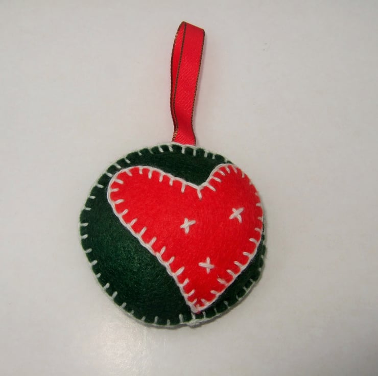 This unique handmade Christmas tree decoration is made from felt off-cuts. The bauble is a dark green with a bright red hand stitched heart applique. The decoration has a red ribbon for hanging on the tree.
