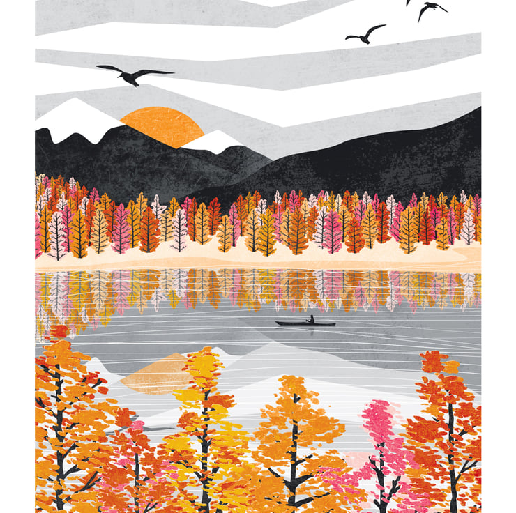 Float and paddle peacefully amongst warm colours and watery reflections with this autumn lake inspired art print.