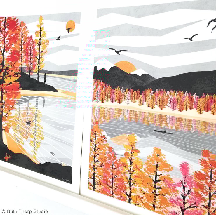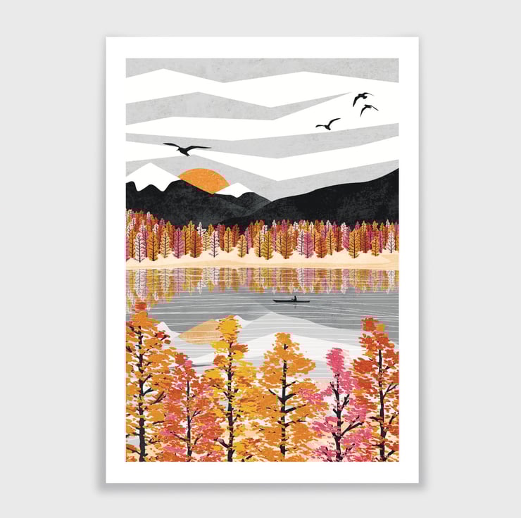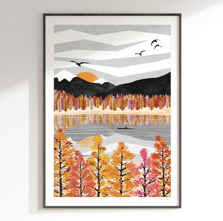 Float and paddle peacefully amongst warm colours and watery reflections with this autumn lake inspired art print.