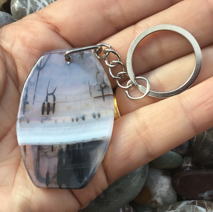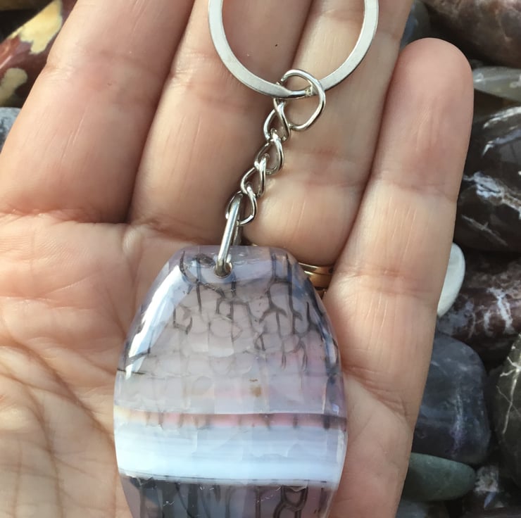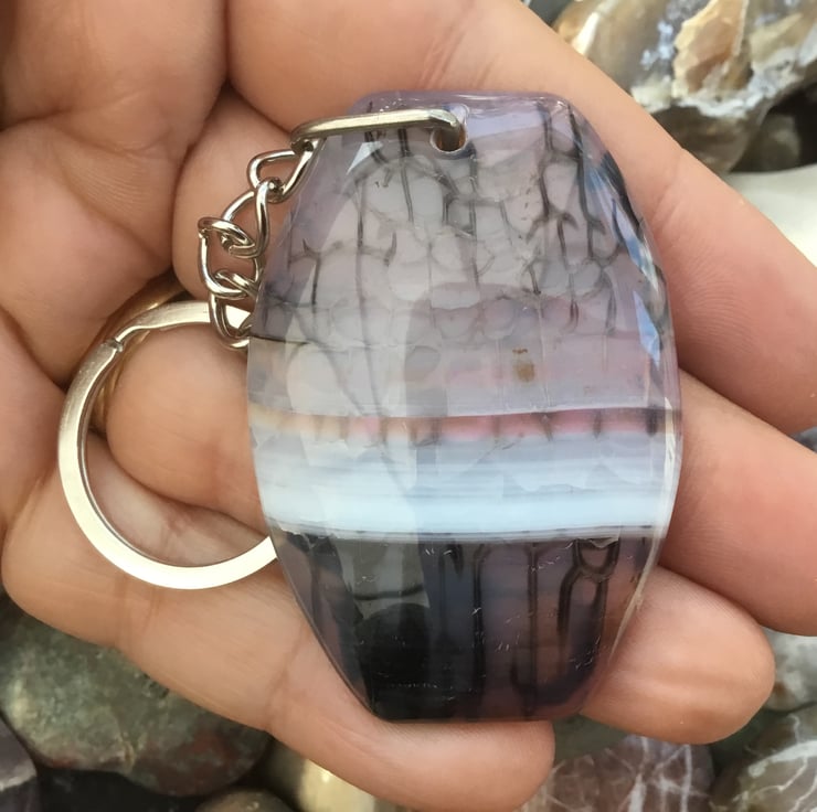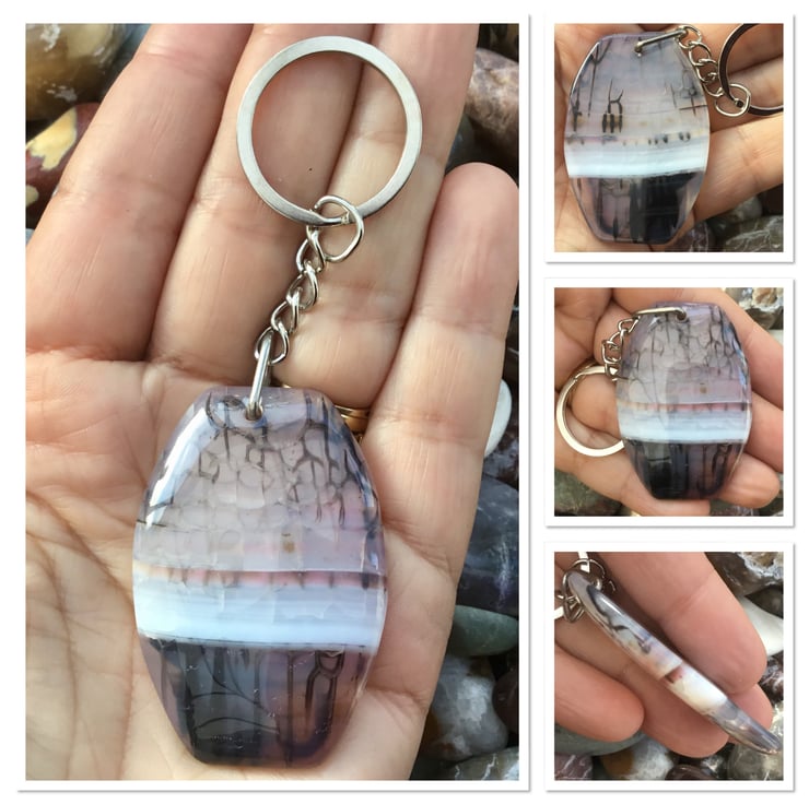Misty Morning! A lovely and substantial rounded rectangular Banded Agate Gemstone Keyring, with silver tone keychain & split ring, to make this item useable as a keyring, or handbag charm.