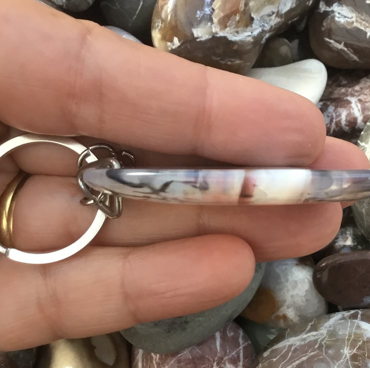 The rounded rectangular gemstone is flat on the back and domed to the front and highly polished all over. It has been simply drilled in the centre of one end, to support a silver tone Triangular bail, from which the curb style keychain & 2.5cm diameter split ring have been attached.