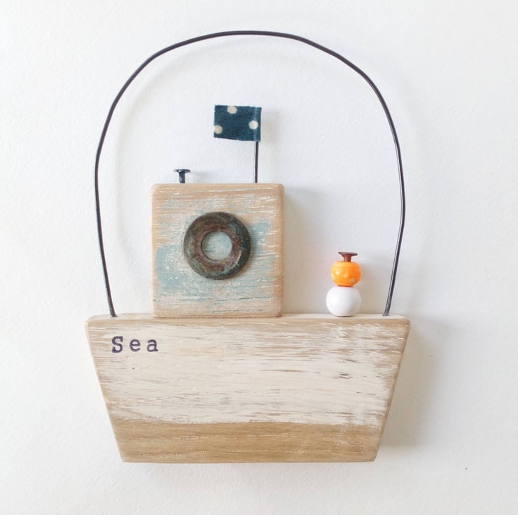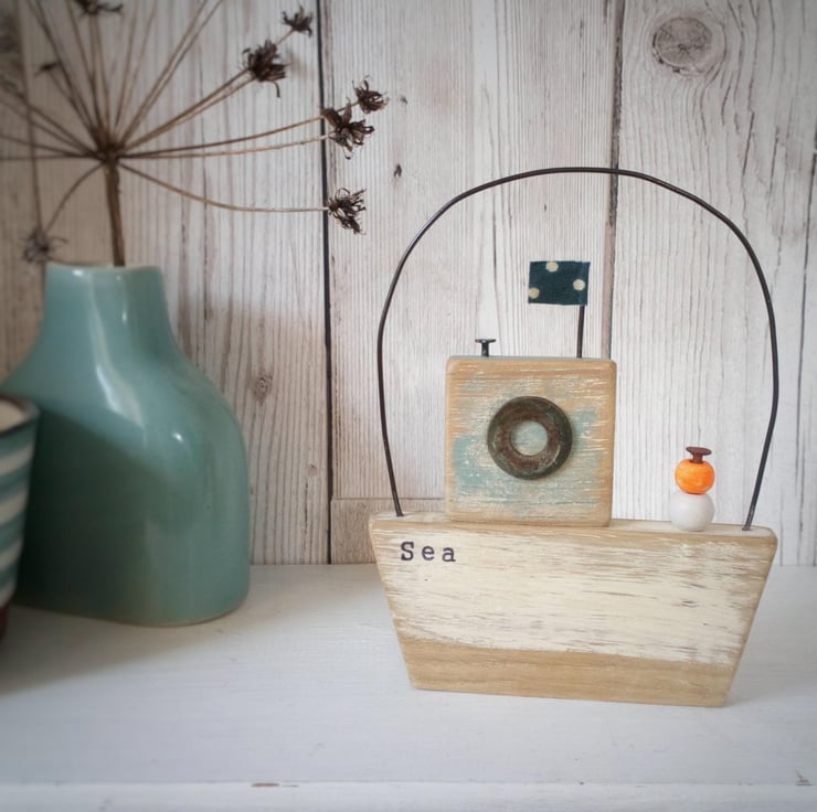 Made from hand painted wood with an old washer for a window, a flag and beads add to the seaside feel of this little hand crafted boat.