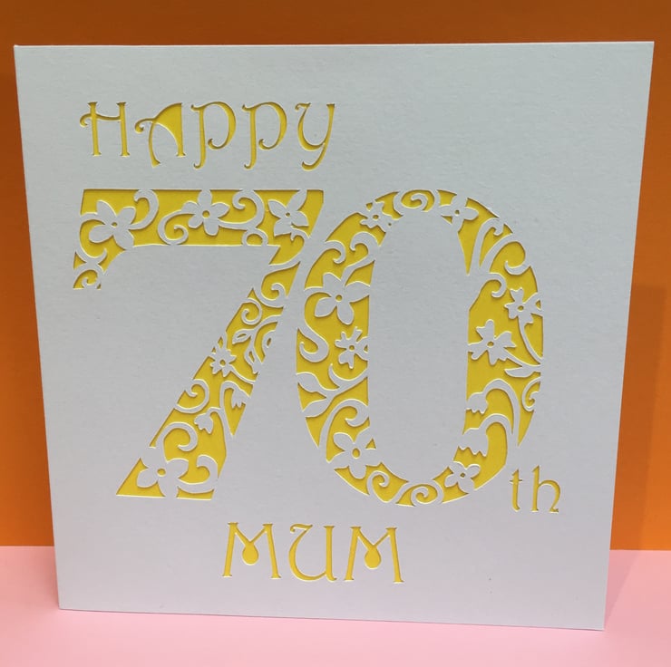 This beautiful 70th birthday card features a delicately paper cut decorative number '70' with a personalised birthday message. Coloured card has then been stuck behind the paper cut card.