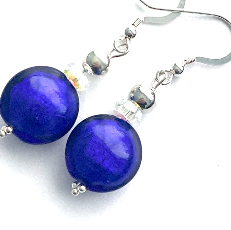 Murano Glass earrings with sapphire blue Murano Glass lentil beads (14mm) and sparkly Swarovski crystals with sterling silver round beads. The earrings hang from sterling silver ear wires and measure 30mm in length excluding wires. They are a wonderful colour and presented in a velvet pouch.