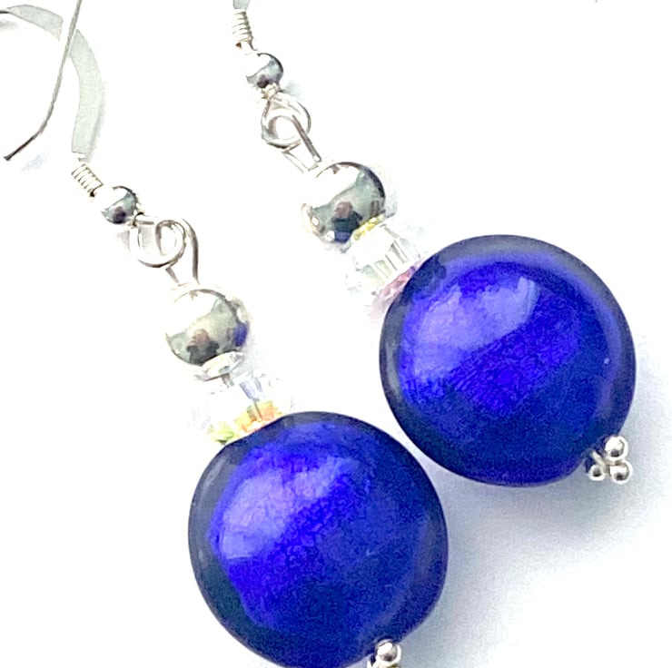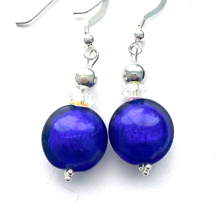 Murano Glass earrings with sapphire blue Murano Glass lentil beads (14mm) and sparkly Swarovski crystals with sterling silver round beads. The earrings hang from sterling silver ear wires and measure 30mm in length excluding wires. They are a wonderful colour and presented in a velvet pouch.