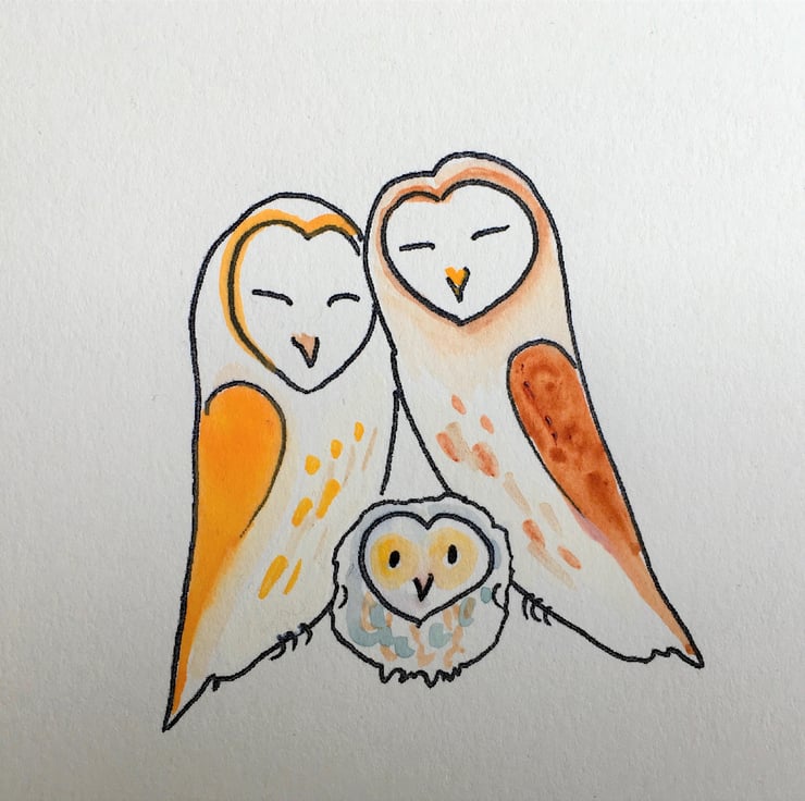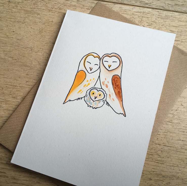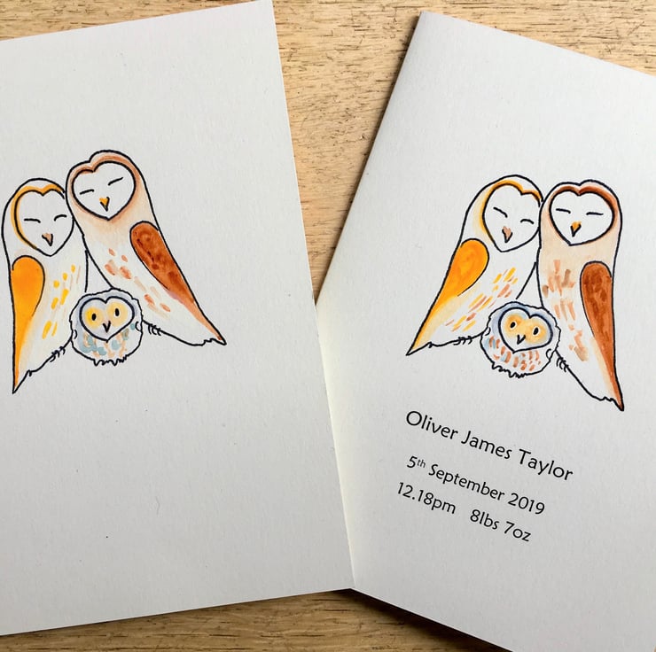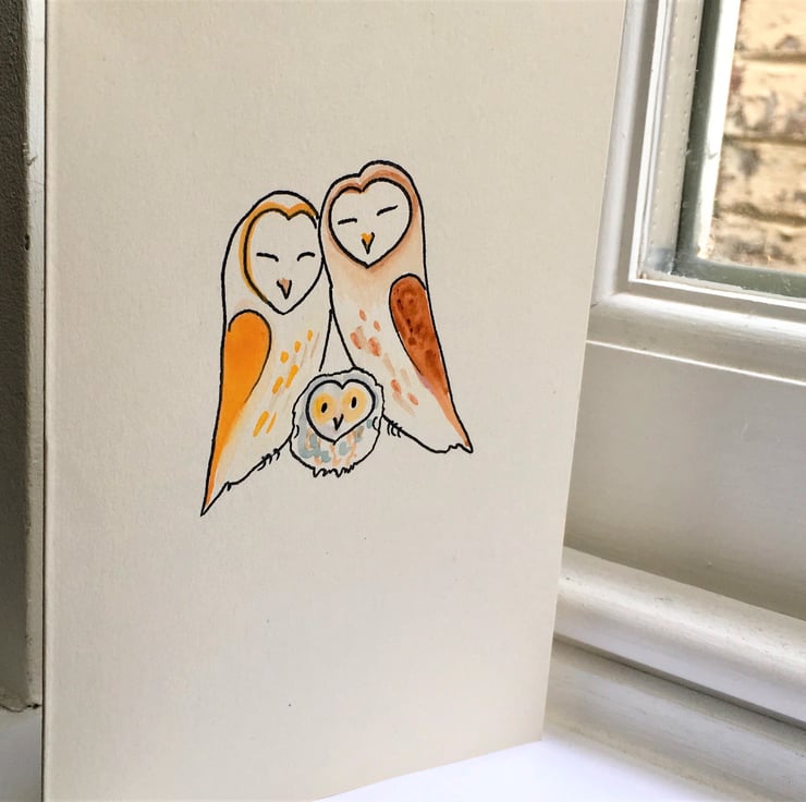This is my Owl Baby card design featuring two Barn Owl parents and their new owl baby. The card is handmade with my original illustration and hand-painted to create a truly special greeting for any new parents and to welcome any baby boy or girl. One supplied. Please contact me if you are interested in multiples of 5 or more.