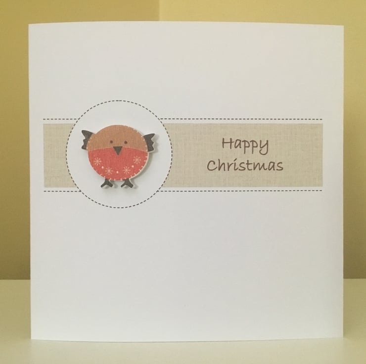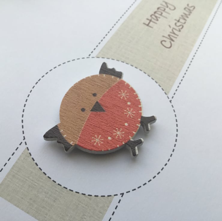 A handmade Christmas card with a cute, wooden robin embellishment.