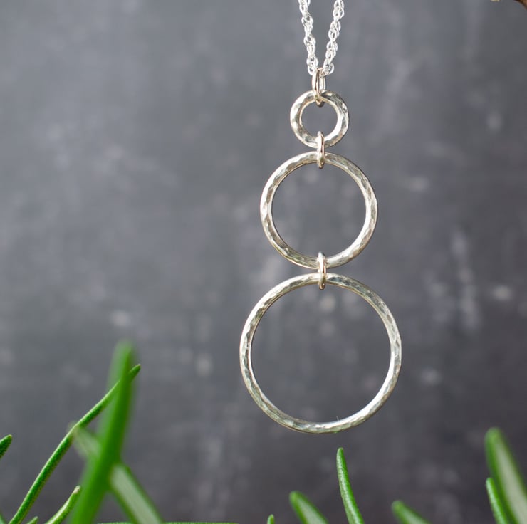This stylish sterling silver pendant features three circles of increasing size, each one hammered to give a beautiful textured finish and polished to a high shine. It's minimalist style makes it so versatile for everyday wear, making it a perfect gift for lovers of artisan jewellery.