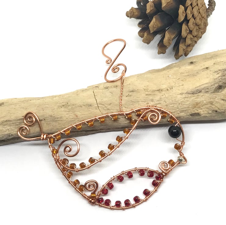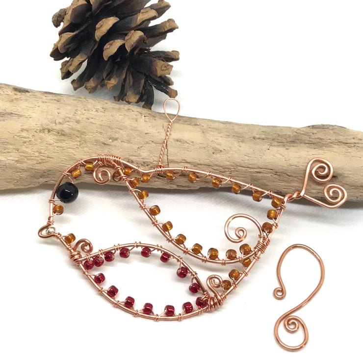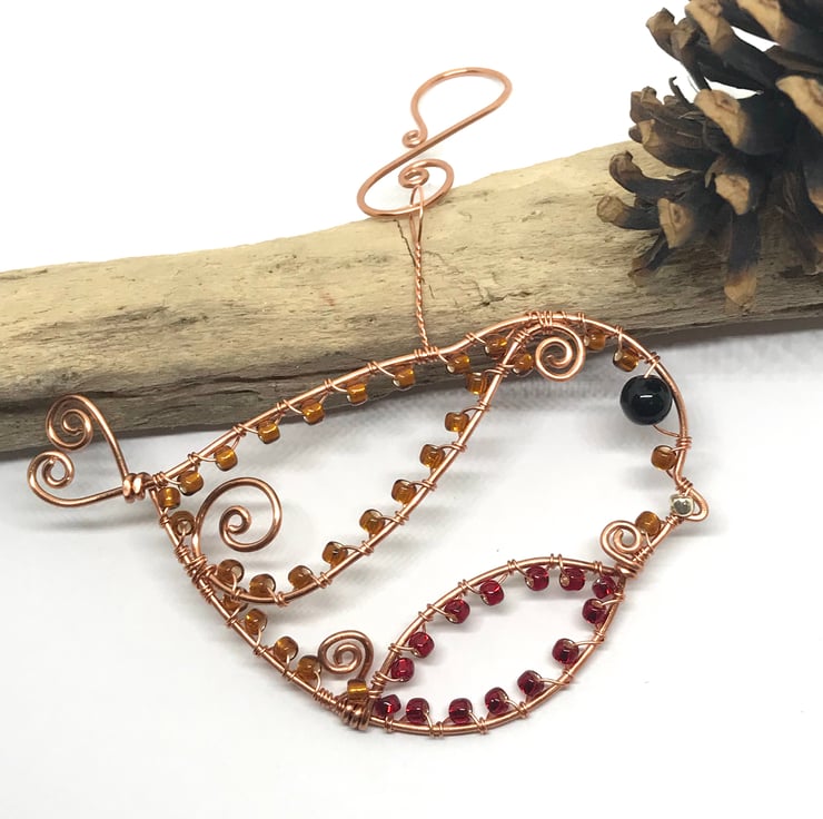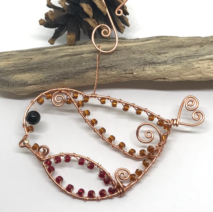 I have formed copper wire into a bird shape and attached swirls of wire for the wing and breast of the Robin with a heart shape detail for the tail. I have wrapped red and bronze seed beads around the shape with a black bead for the eye and gold coloured bead for the beak. Twisted wire for the loop and a handcrafted copper hook for hanging.