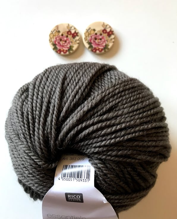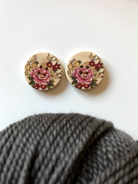 Floral print wooden buttons chosen to compliment the yarn colour