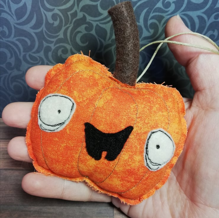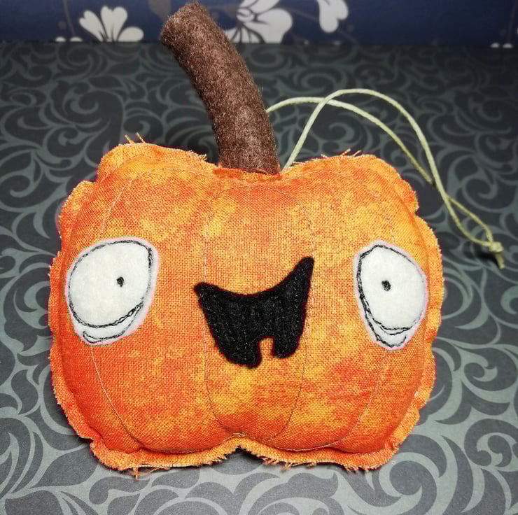 Cute and creepy Halloween hanger made from cotton with raw edging and machine embroidered face including felt eyes and mouth. Pumpkin has a brown felt stalk and measures roughly 9.5cm across and has a wax thread hanger attached to the back.