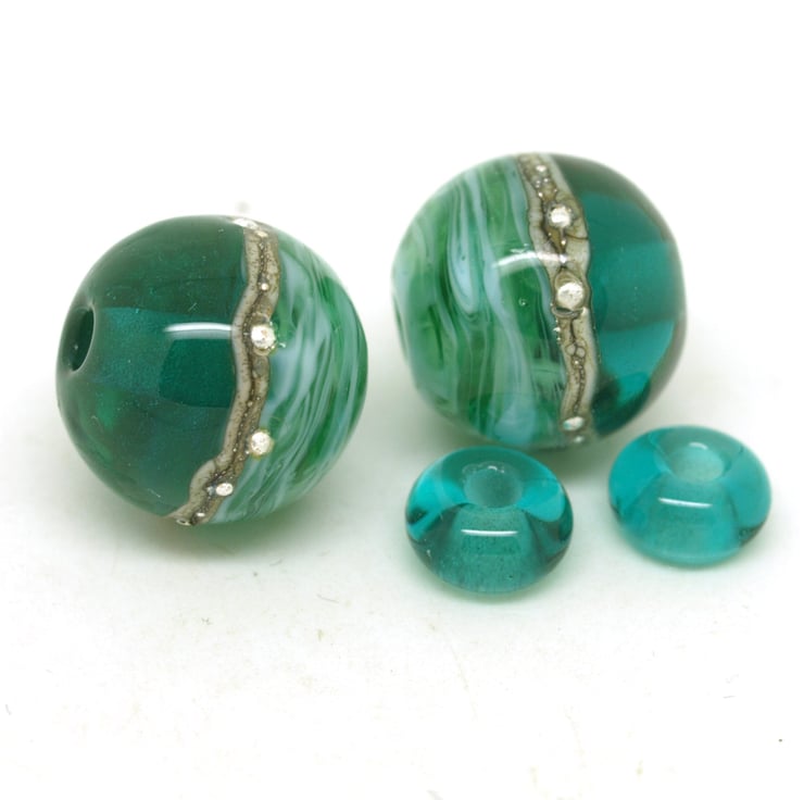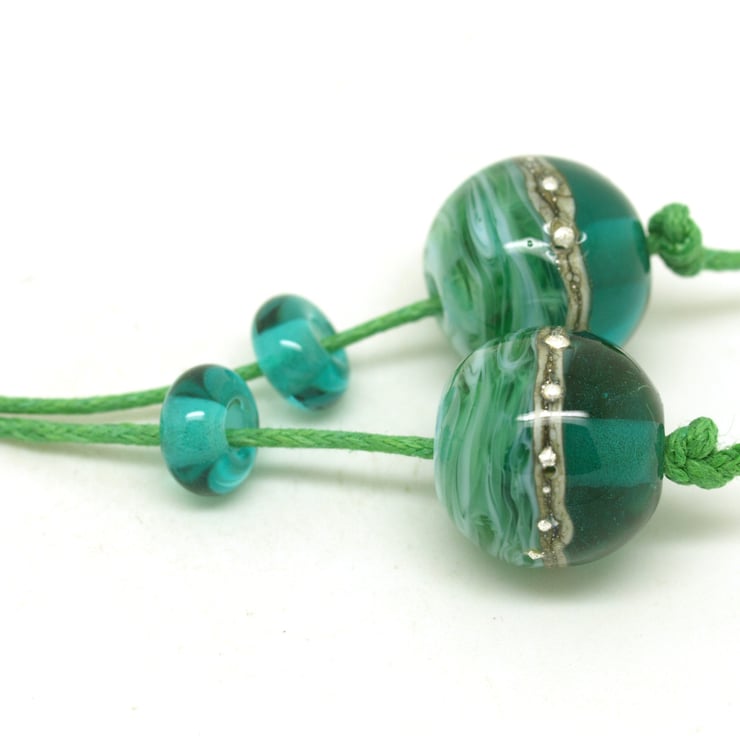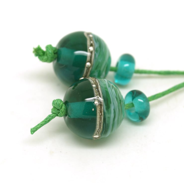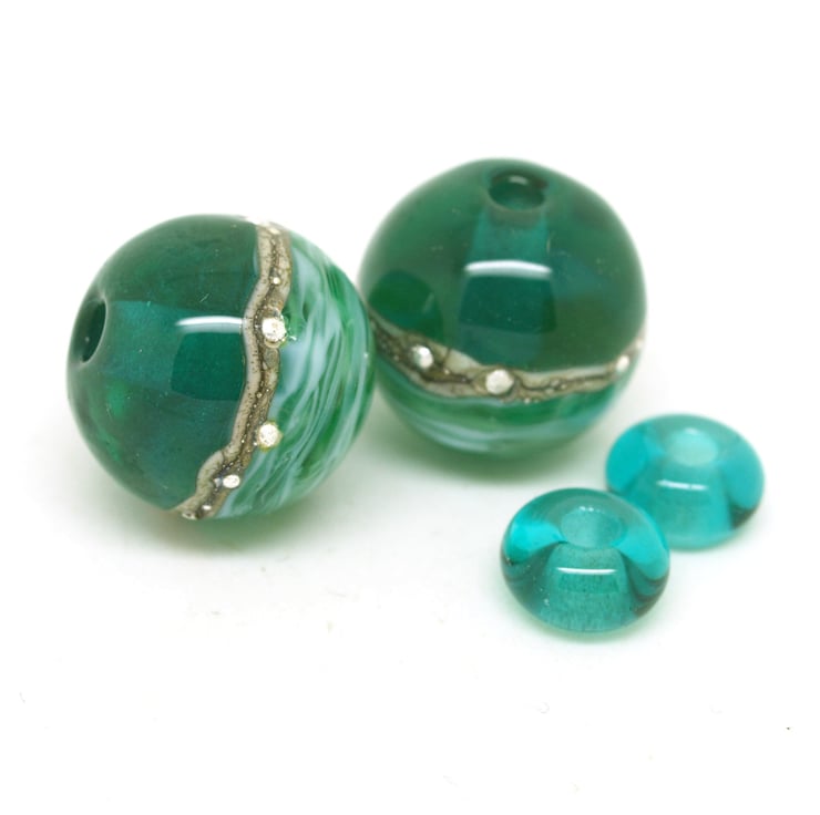These handmade glass beads feature transparent light teal and a glass called Caribbean Sea with a streaky effect in pale blue and transparent teal green. A band of silvered ivory stringer has been laid around the centre of the beads and dots of pure silver foil have been added.