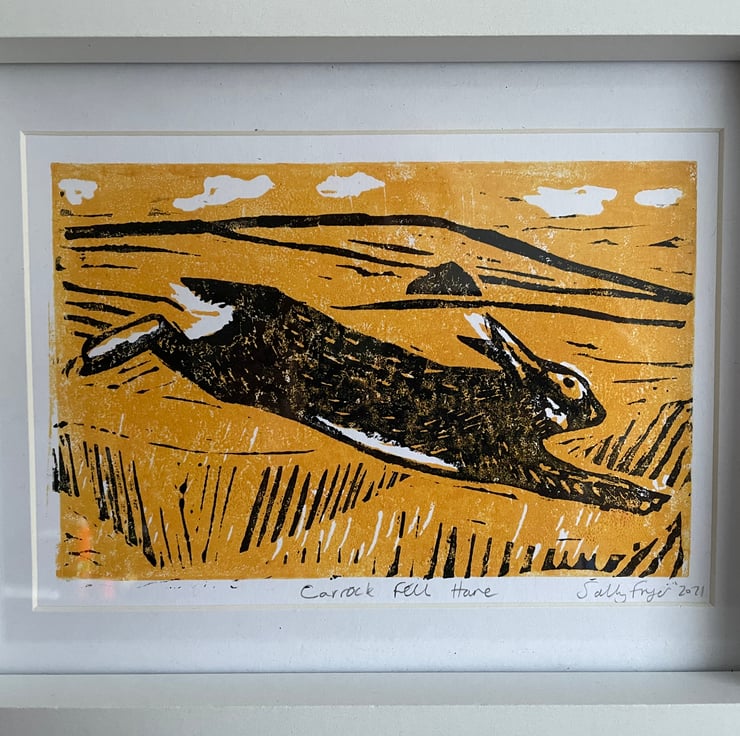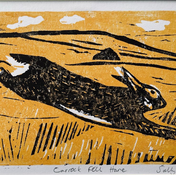 This image is of a hare running through the fields of the Northern Pennines in England where I live. It is printed by hand from a lino cut and is an original print NOT a printed reproduction!!