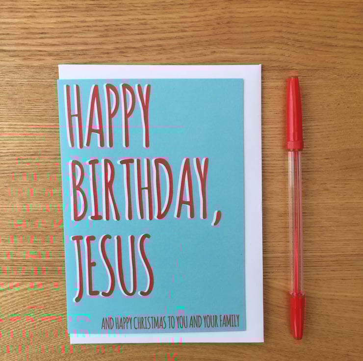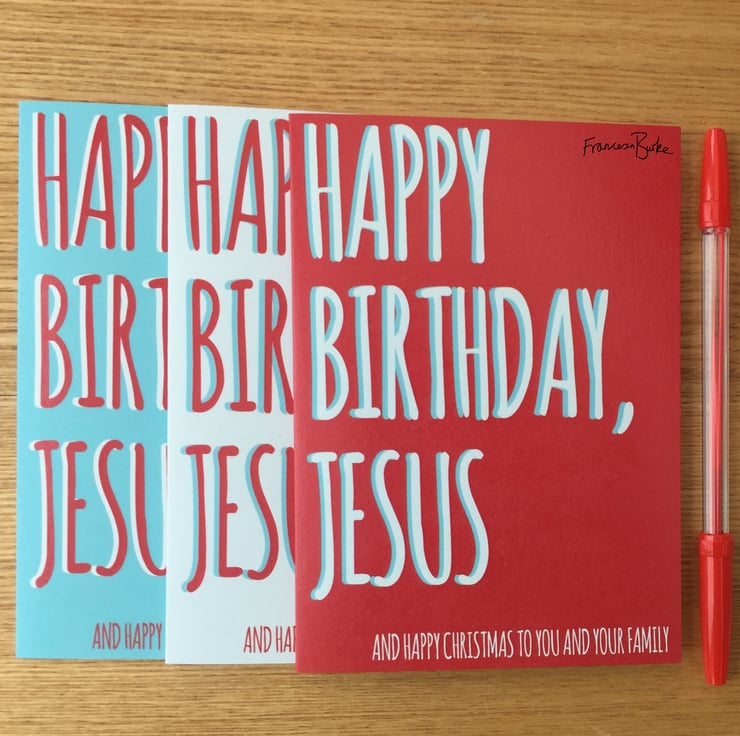 Cards read 'Happy Birthday, Jesus' on white, red or blue card.