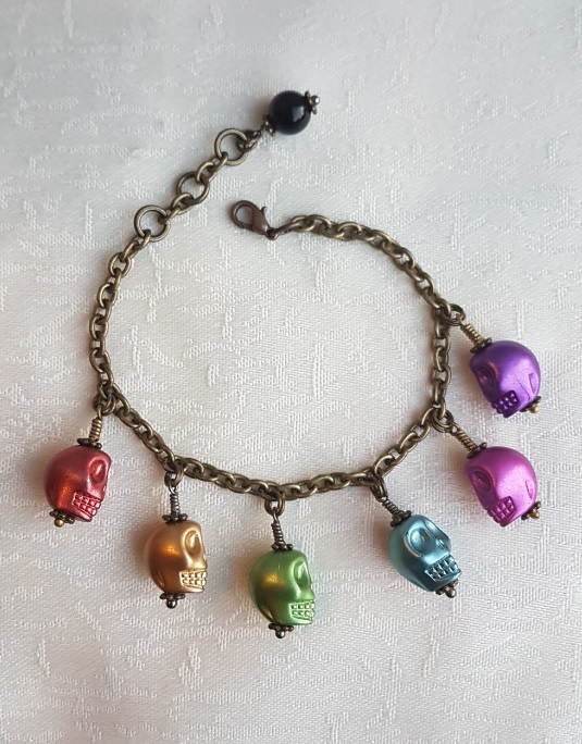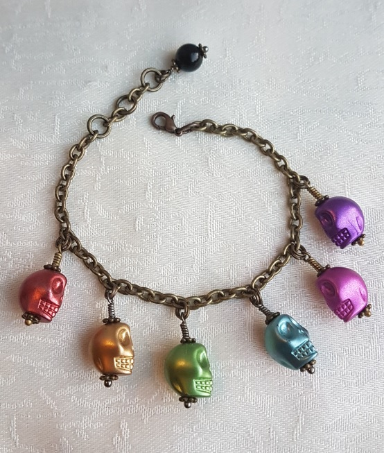 A lovely Bronze tone chain bracelet with Spooky Acrylic Skull beads. A great Halloween piece or just if you like unusual Skull jewellery.