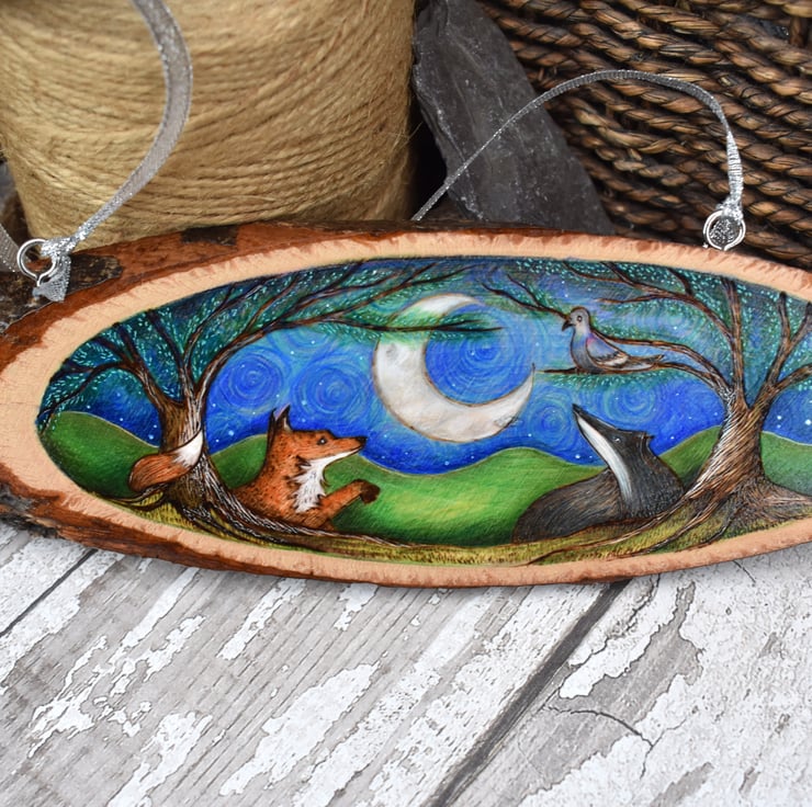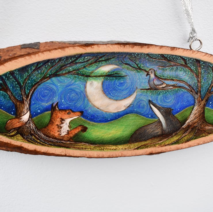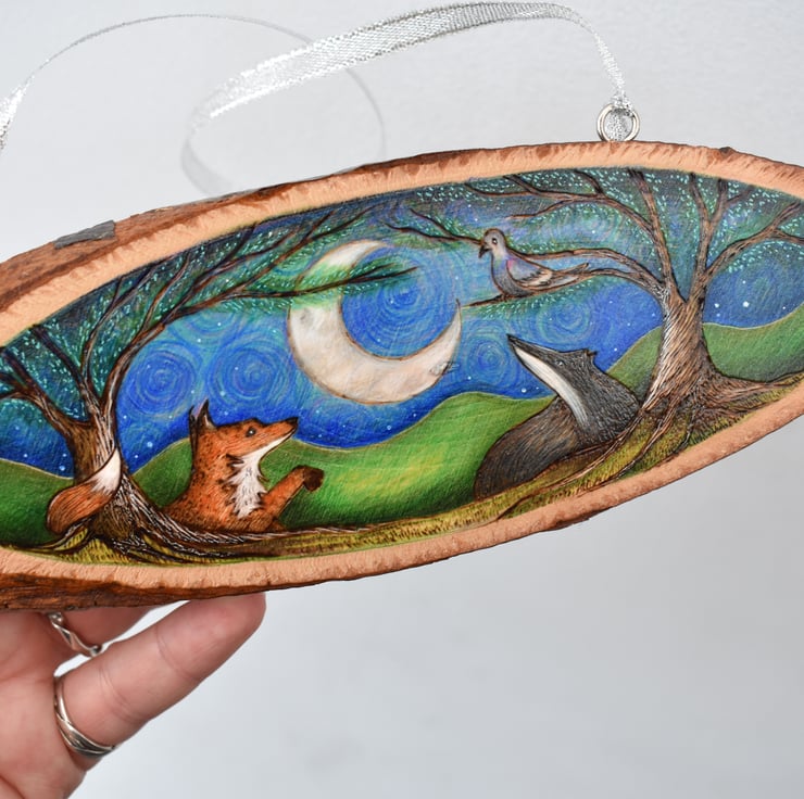 This oval hanging wood slice plaque is hand burned using pyrography and the coloured using prismacolor pencils.