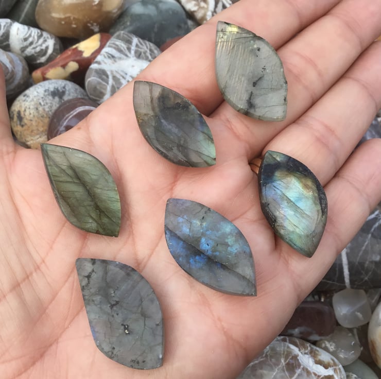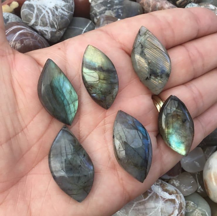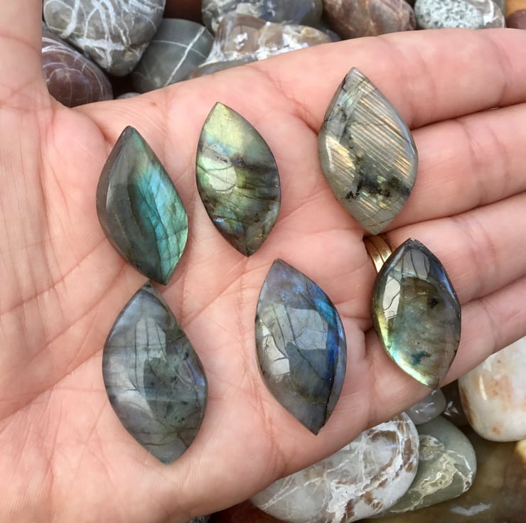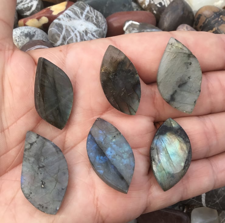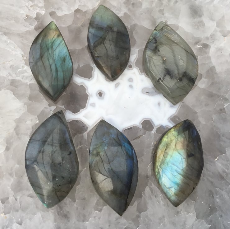 A complete set of Six Cabochon blue grey Labradorite gemstones that have lots of inner blue and golden fire and light play, which catch the light beautifully and would make a fantastic focal centre pieces in necklaces, or together in a bracelet.