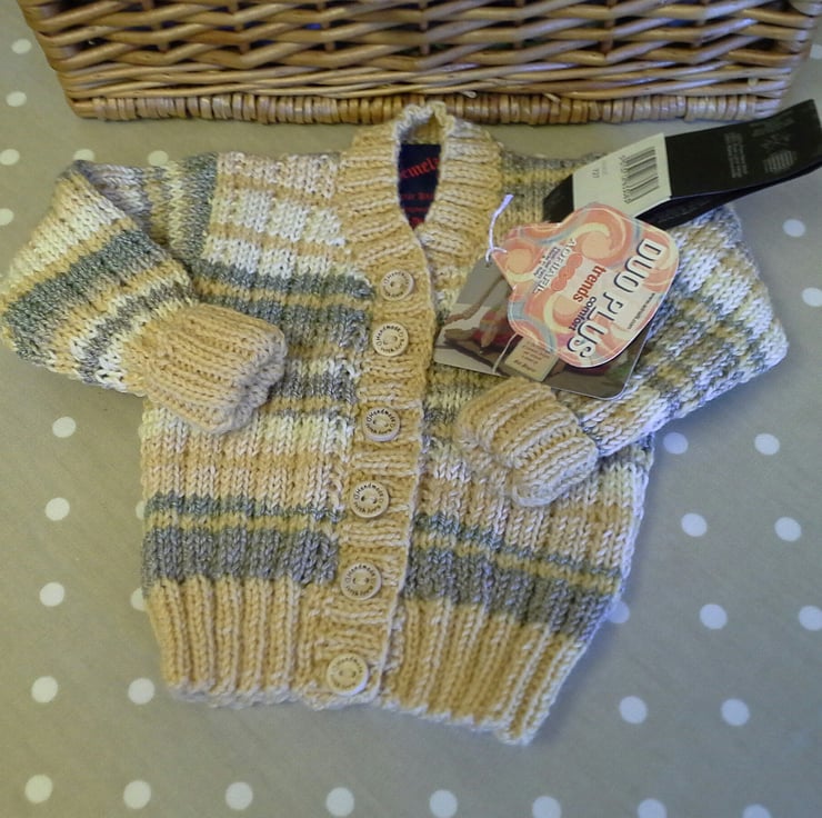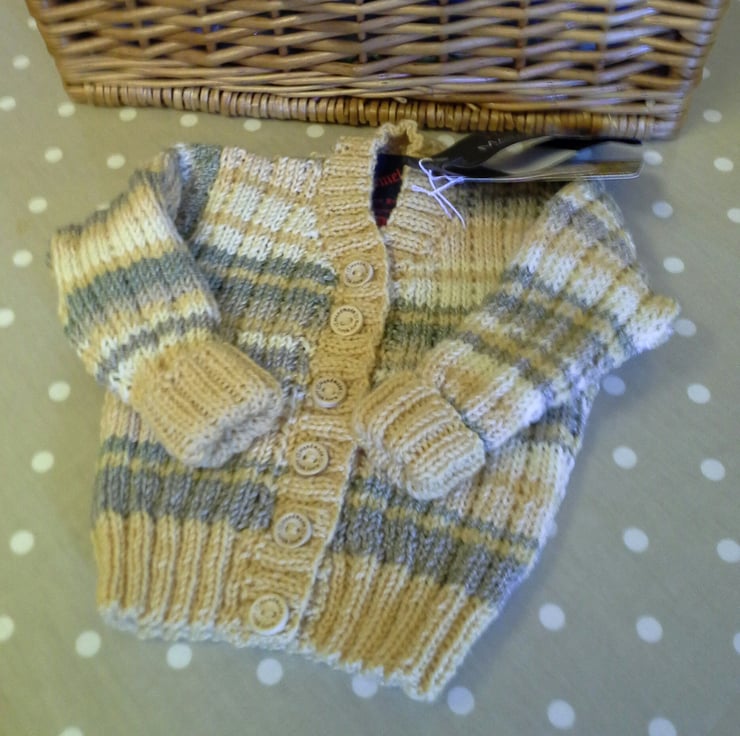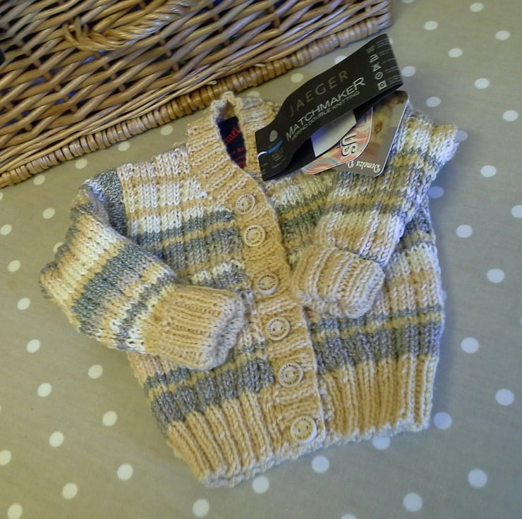 A beautifully soft hand knitted natural fibre baby cardigan designed and hand crafted in Cornwall using sand coloured pure 'Jeager' Marino wool complimented with 52% pure new wool with 48% cotton multicoloured yarn.
