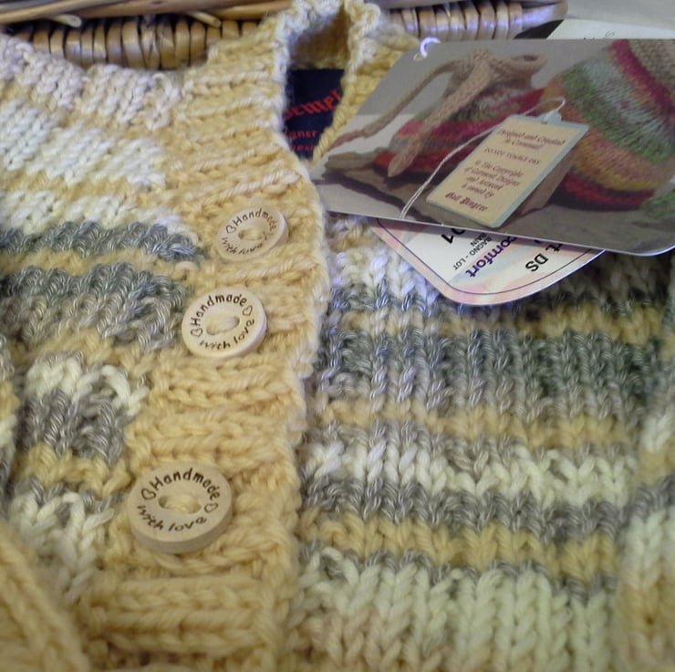 The original ball bands are attached to the garment with the Demelza swing tag alongside the designer's garment tag attached to the back neck edge. The buttons are made from genuine wood with a loving sentiment burnt etched on them.