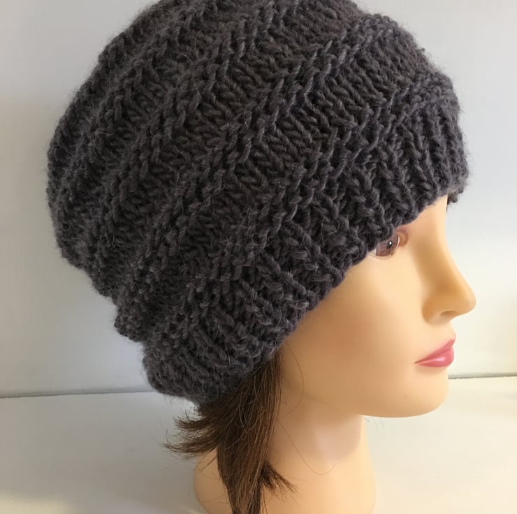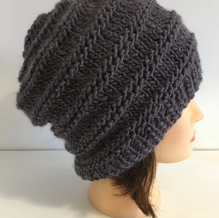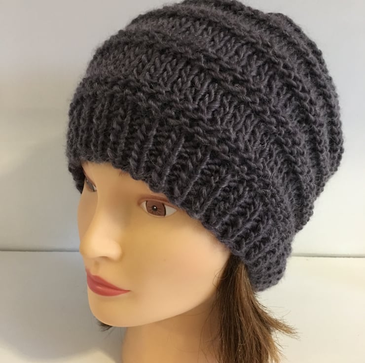 This plum coloured autumn and winter knitted hat features deep ribbed edging, and a mixture of knit and purl stitches to give added appeal.