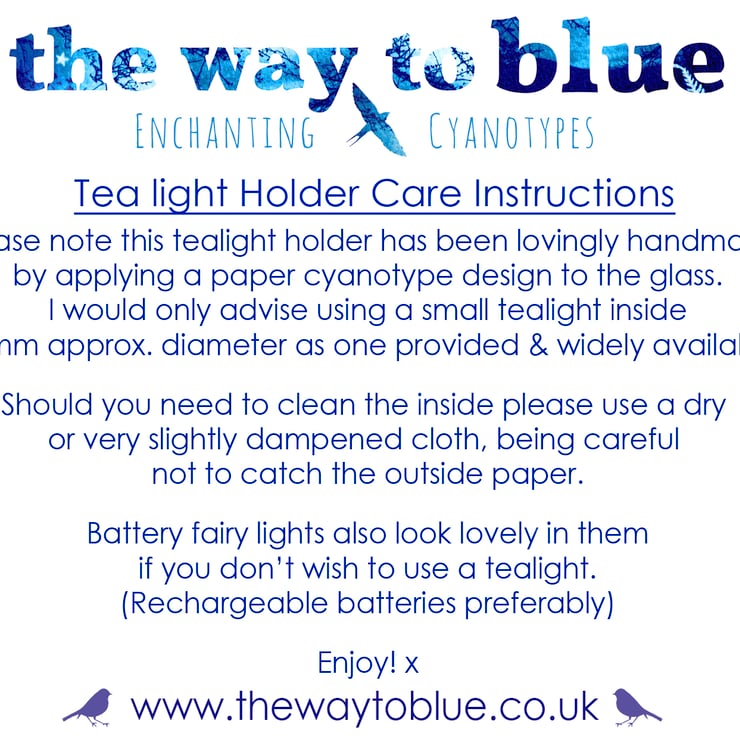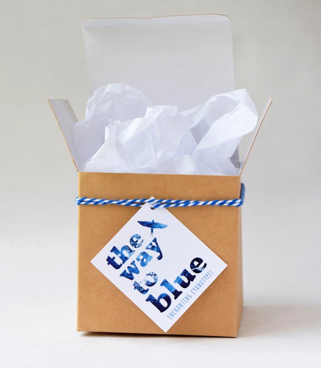 When ordered with a candle holder or mug, the item will be wrapped in crisp white tissue with blue striped bakers twine. Details about 'The Way to Blue', the Cyanotype process and care instructions will be included.