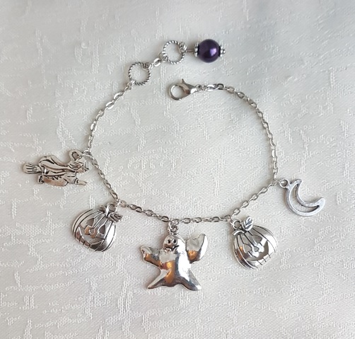 Ghoulish Halloween jewellery. Great as a gift or as part of your costume. A selection of Halloween themed charmed suspended on a steel chain bracelet. Spook-tacular for Halloween fans or those who love creepy-cute jewellery.