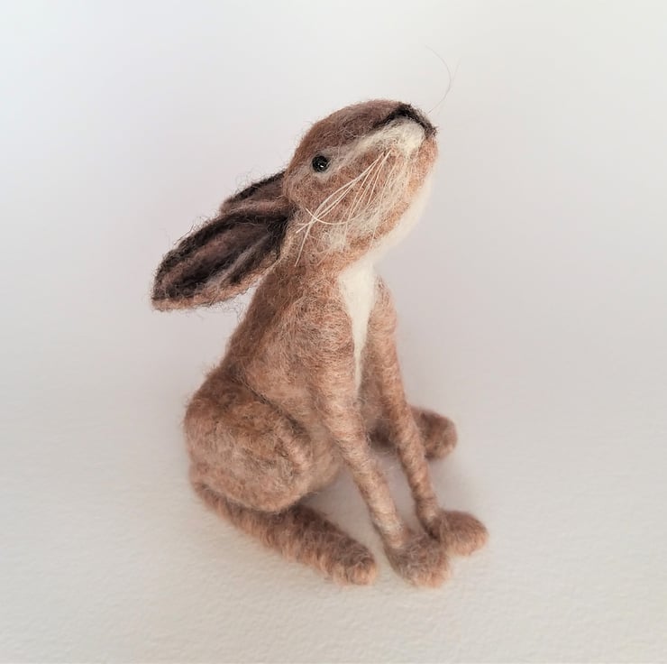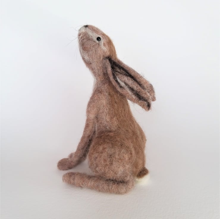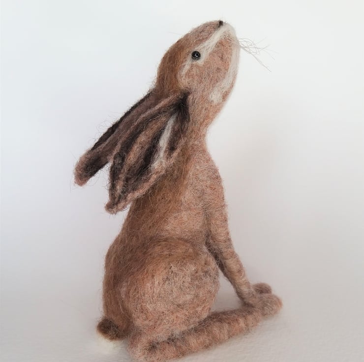 Hattie is a moongazing hare, loving crafted in needle-felted in Corriedale wool, with touches of natural and black shetland. She has glass bead eyes and an abundance of horsehair whiskers.