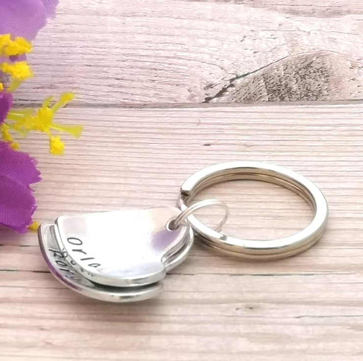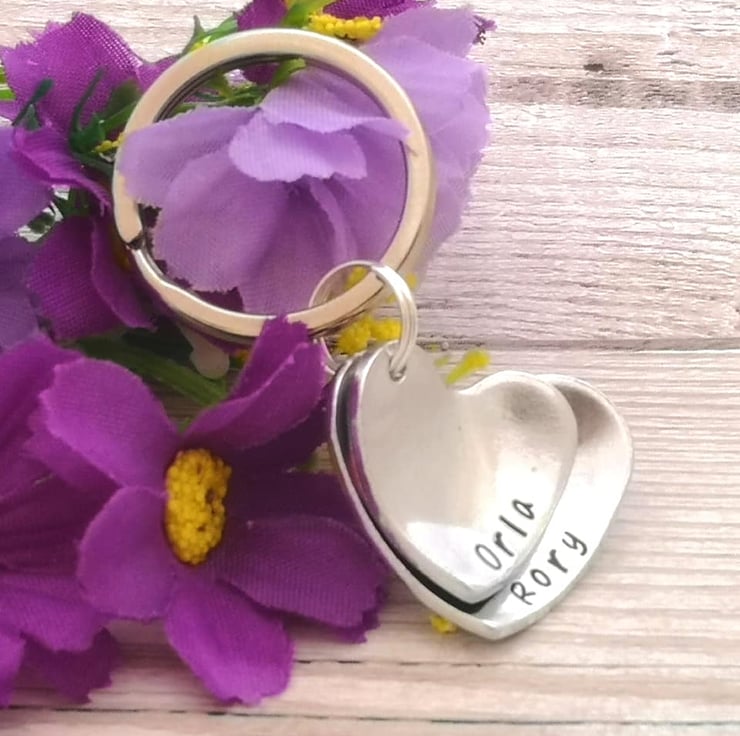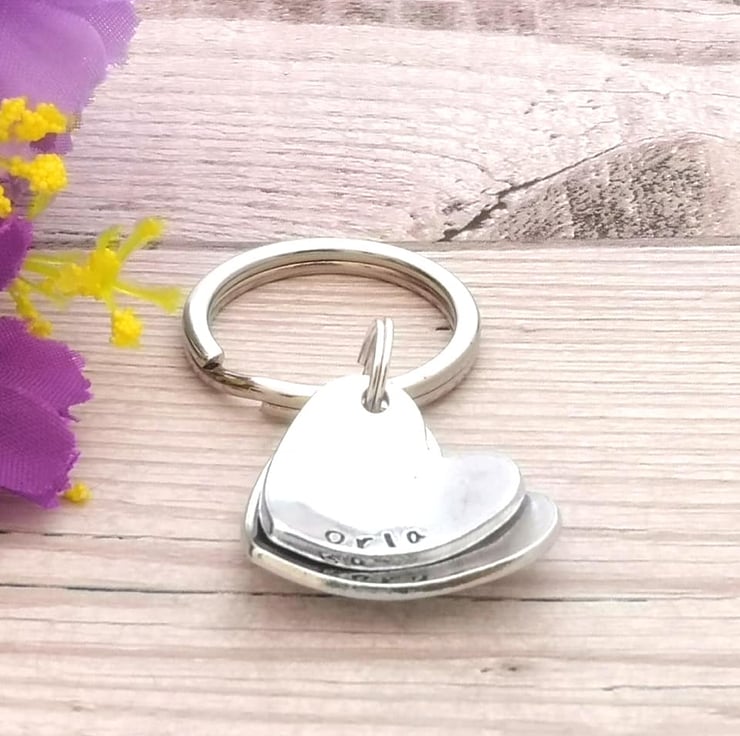 Personalise this beautiful stacked and domed heart keyring with two names. A lovely gift for a Mum of two, Grandma, or as a couples gift.