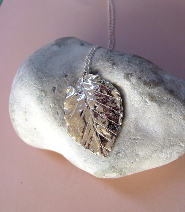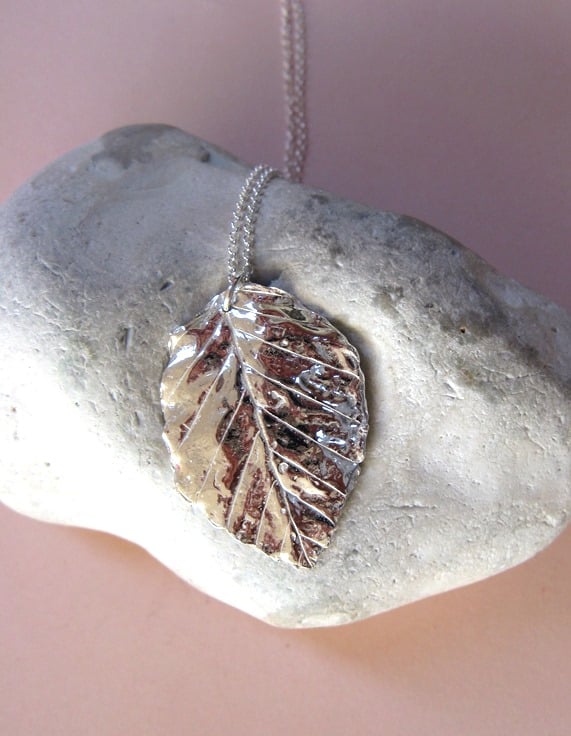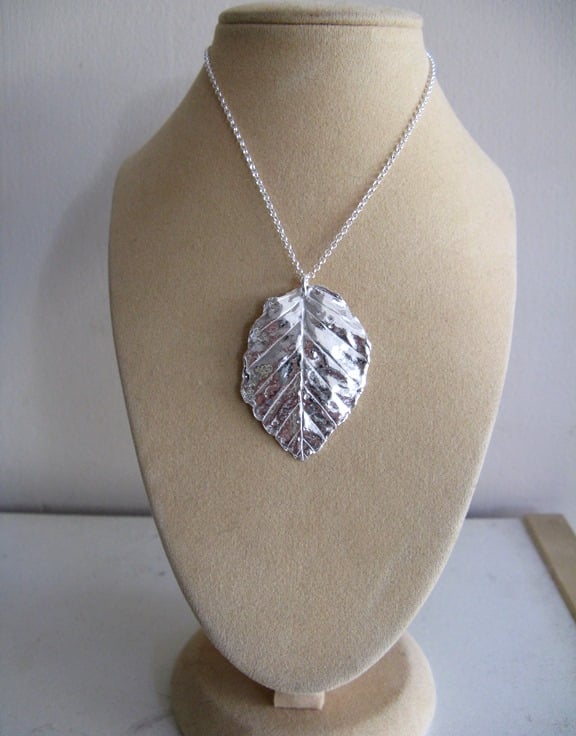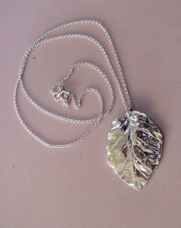This stunning necklace was made by coating a real beech tree leaf in multiple layers of recycled fine silver (pure silver), leaving a detailed replica of the original after firing.