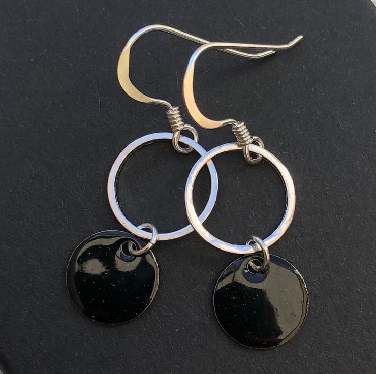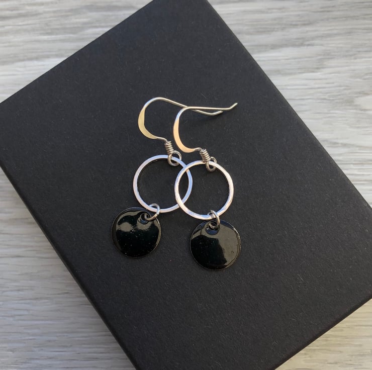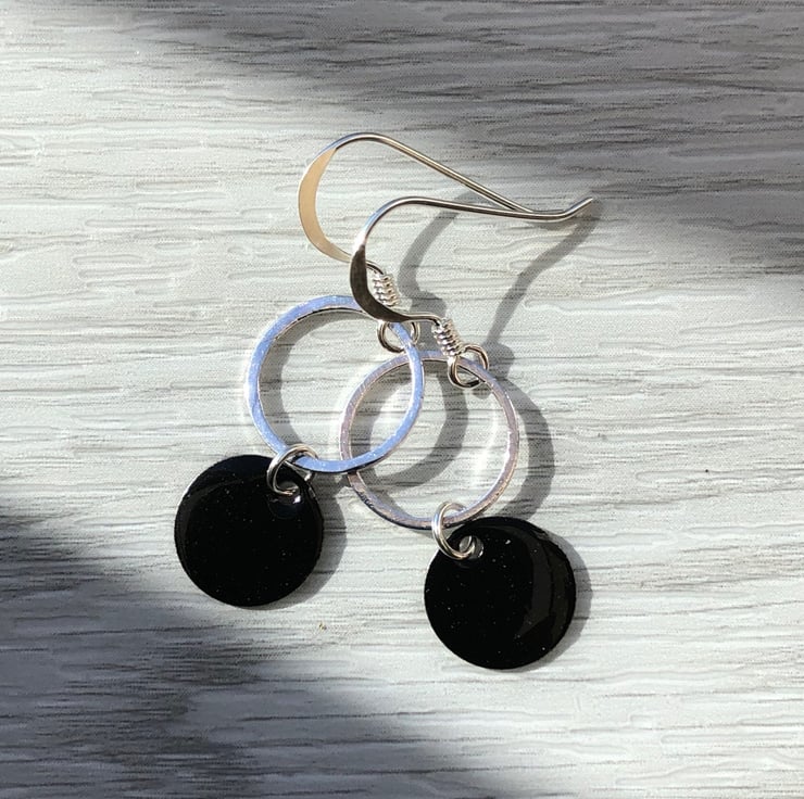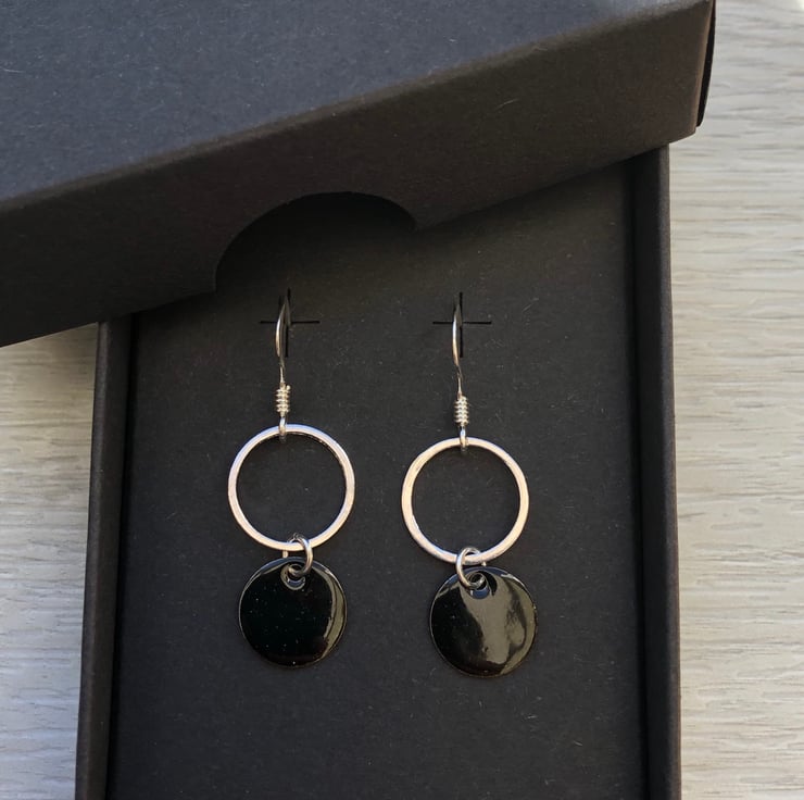 10mm stainless steel circle charms have been hand enamelled using the cold enamel technique. I have added these to silver plated 11mm circle whiz links using sterling silver jump rings and added them to sterling silver fish hook ear wires.