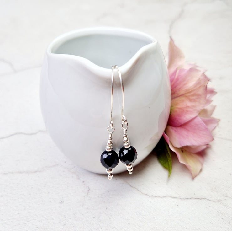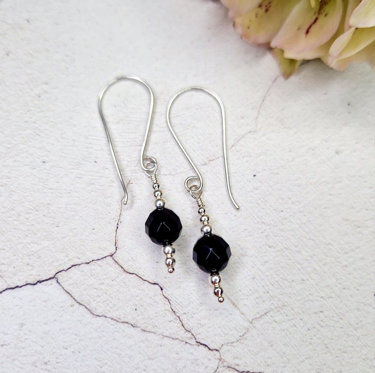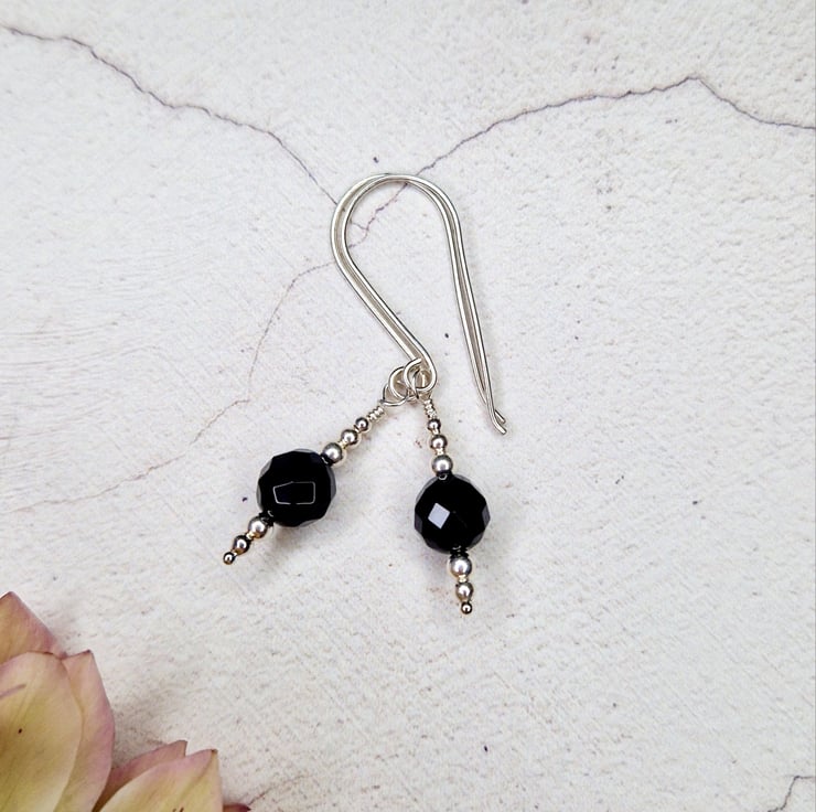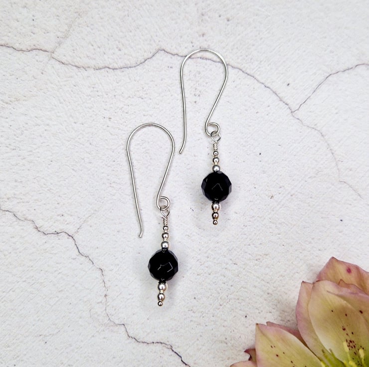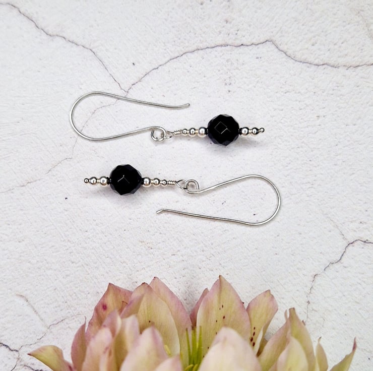 Faceted black onyx and silver bead drop earrings