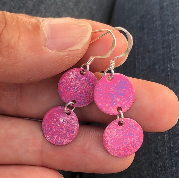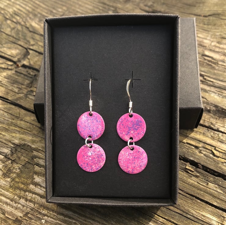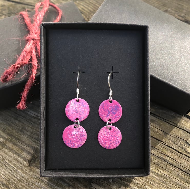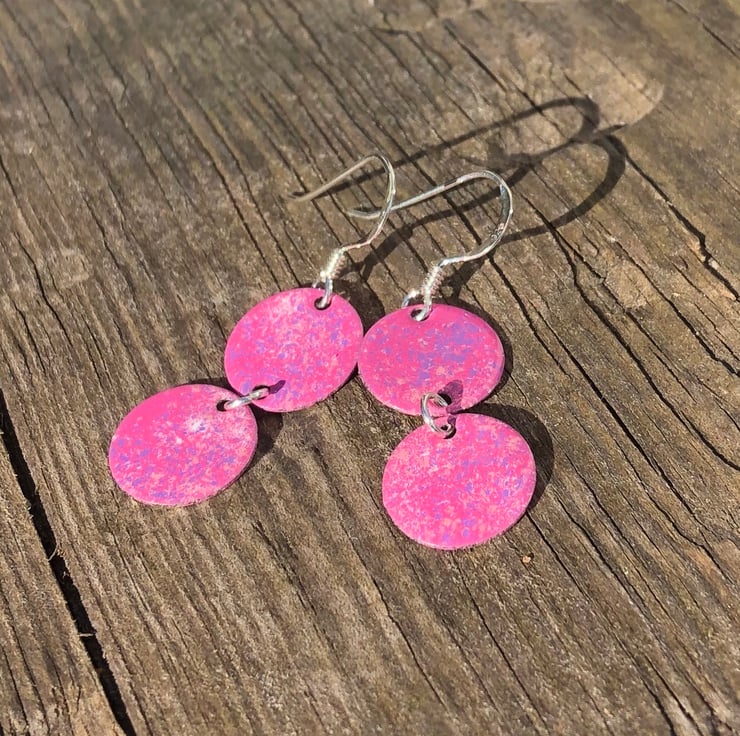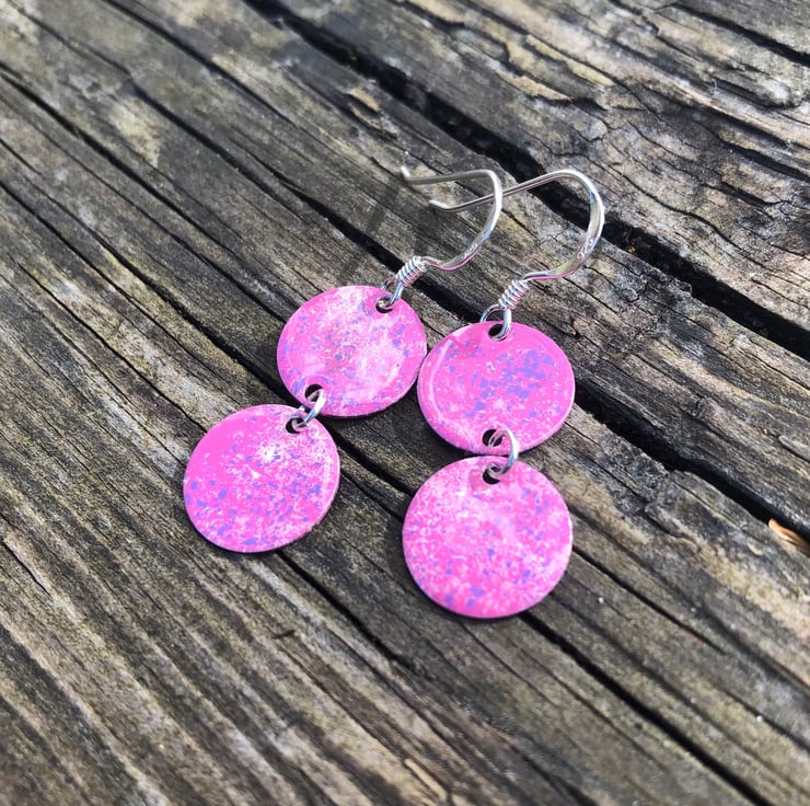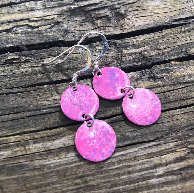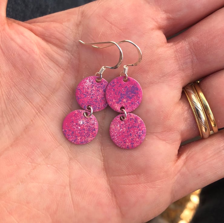 12mm Circle stainless steel circle charms have been hand enamelled using the cold enamel technique. These have been joined together using a sterling silver jump ring and have been hung from sterling silver fish hook earring wires.