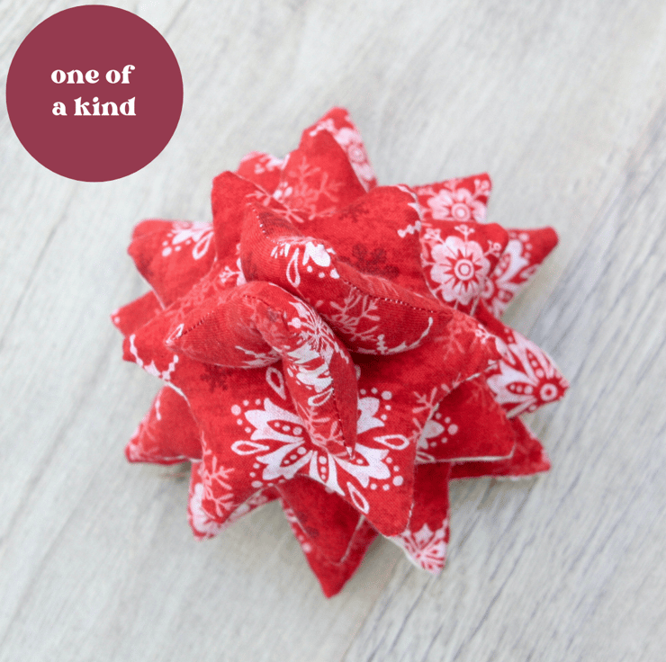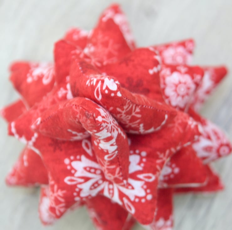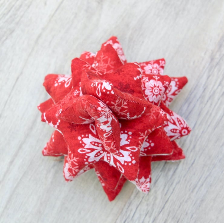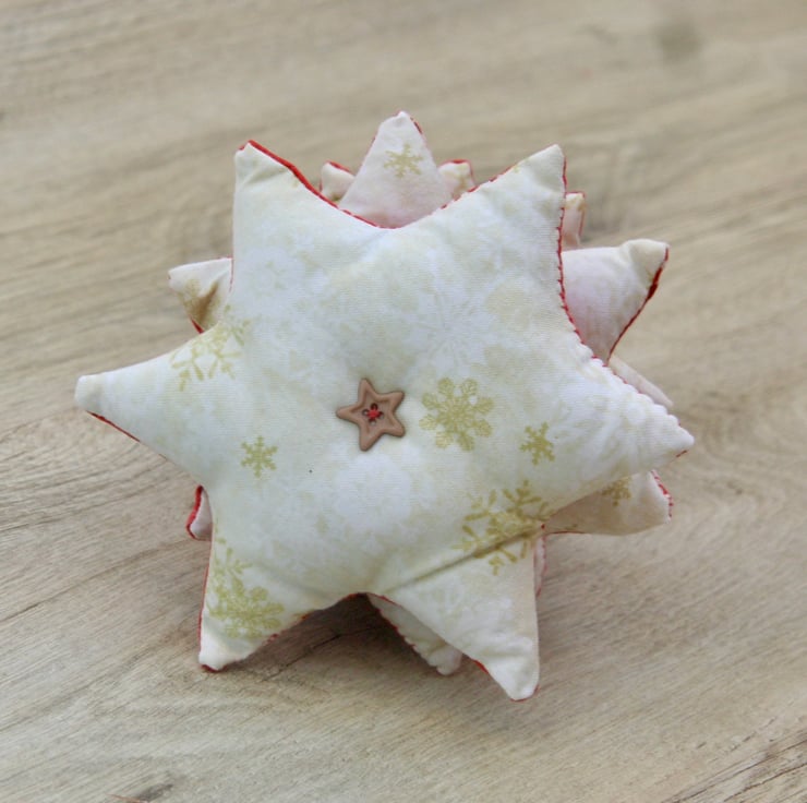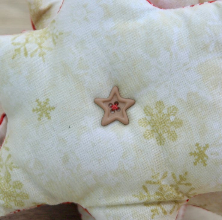 The cotton is a red and white snowflake design and the button at the bottom is star-shaped.