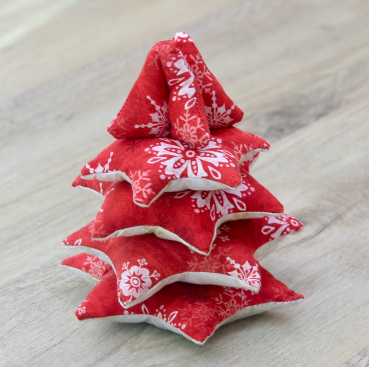 The tree is approximately 17cm tall and approximately 14cm in diameter across at the base. It is made up of 5 sections. Each section has 2 pieces of star shaped high quality cotton, machine sewn together and stuffed with polyester stuffing. The top section is triangular pieces sewn together to form the top of the tree. I finish by hand sewing the gap closed and then sewing the pieces together, again by hand.