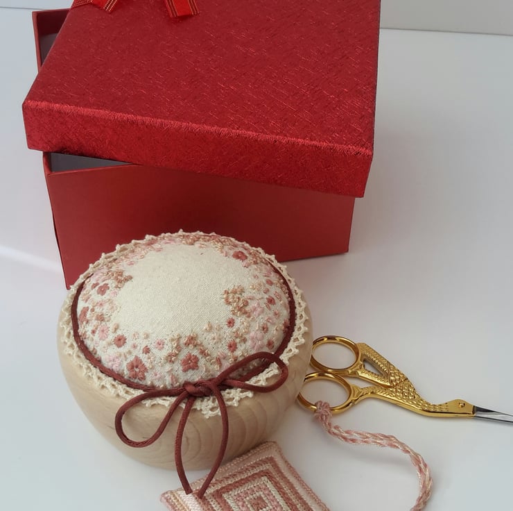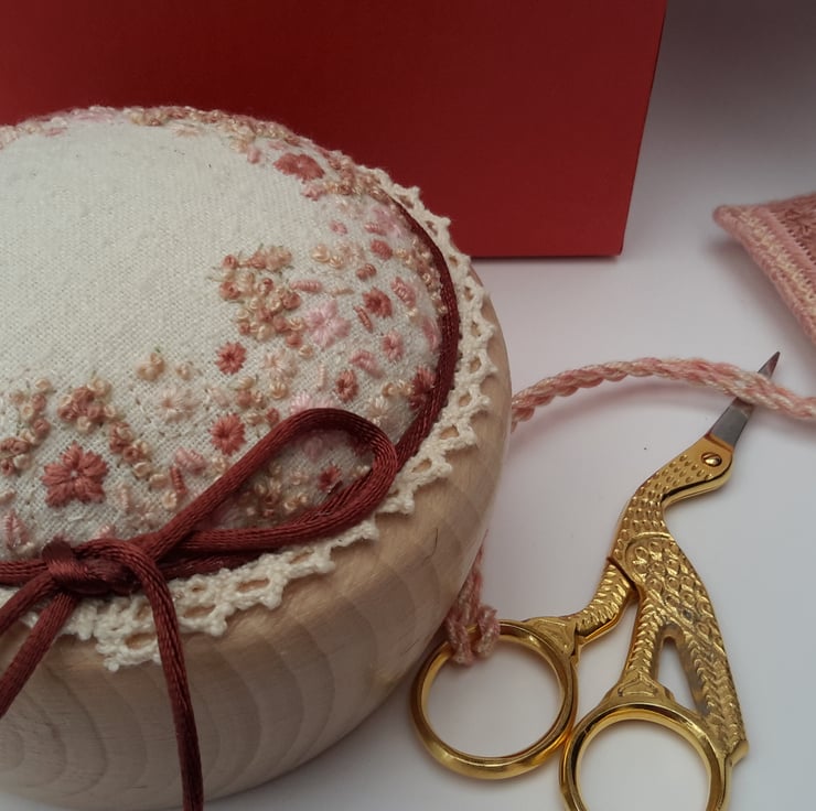 The pincushion has been hand embroidered in salmon pinks/plums/pale pink/naturals using various stitches onto natural silk noil then mounted into a 4" (approx ) wooden bowl. Finished with natural crochet lace trim and rolled satin ribbon.