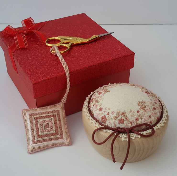 A beautiful and unique handmade gift set using hand embroidery. Designed by Bearlescent for the sewing enthusiast. Set includes a Hand embroidered pin cushion, embroidery stork scissors and needlepoint scissor keep in a purchased red gift box with bow.