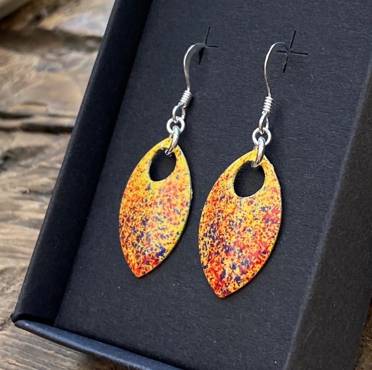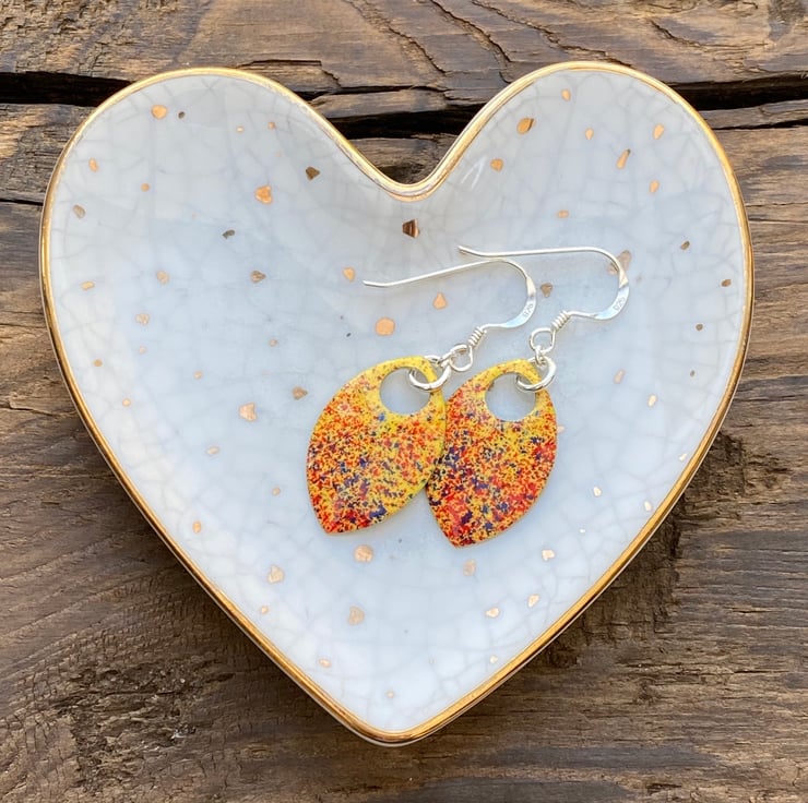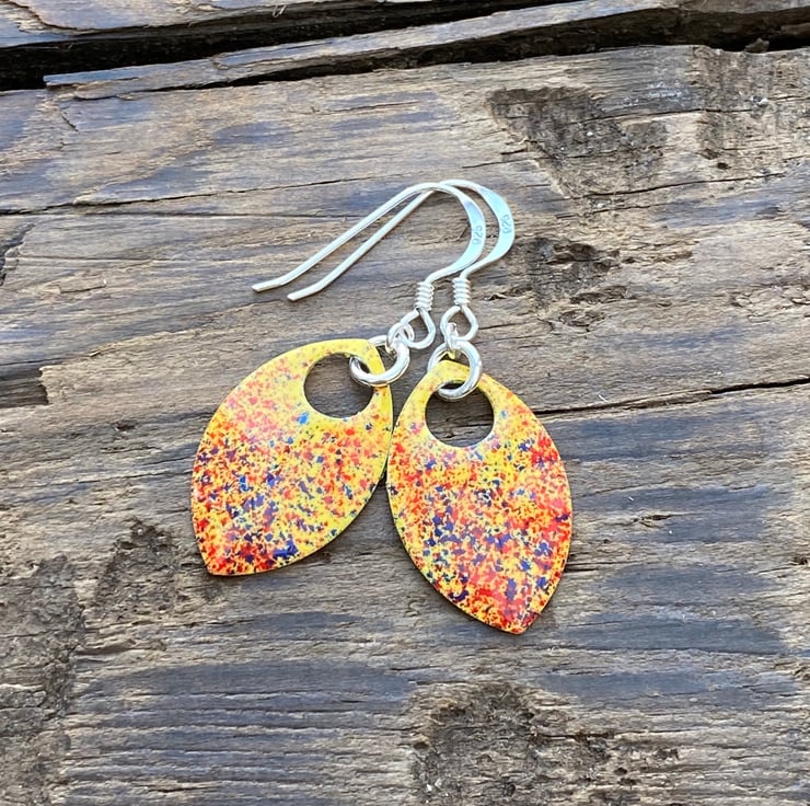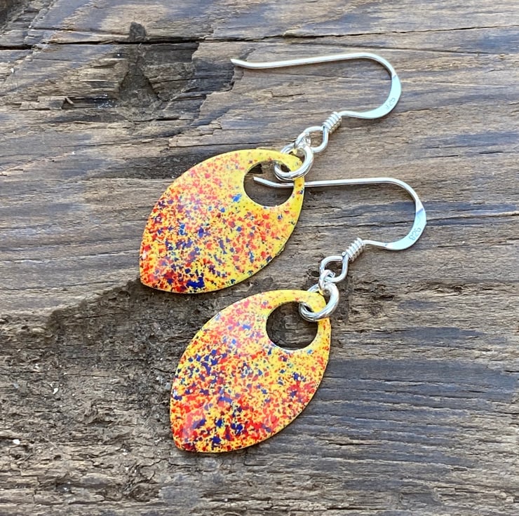 Yellow red and blue enamel scale earrings. Sterling silver.