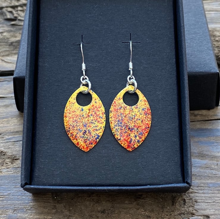 Super light weight aluminium scales have been hand enamelled in a number of layers of cold enamel. These hang from sterling silver fish hook earrings using sterling silver jump rings. The back of the scale remains blank, silver in colour.