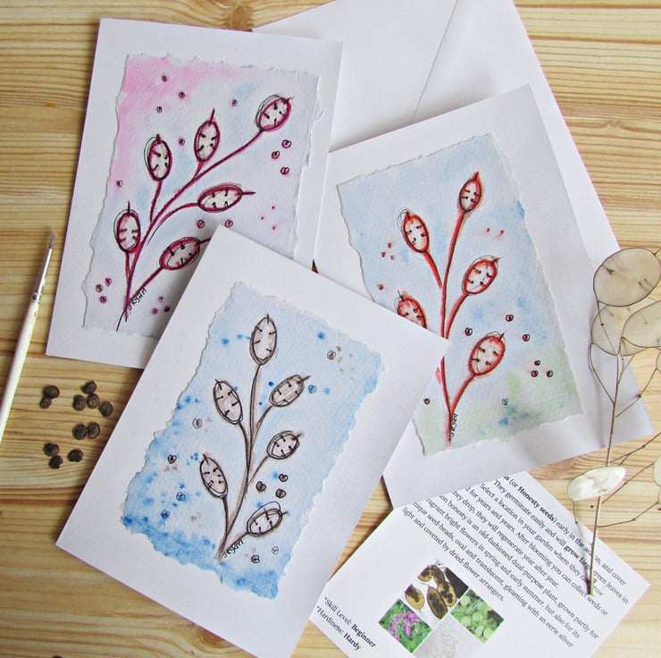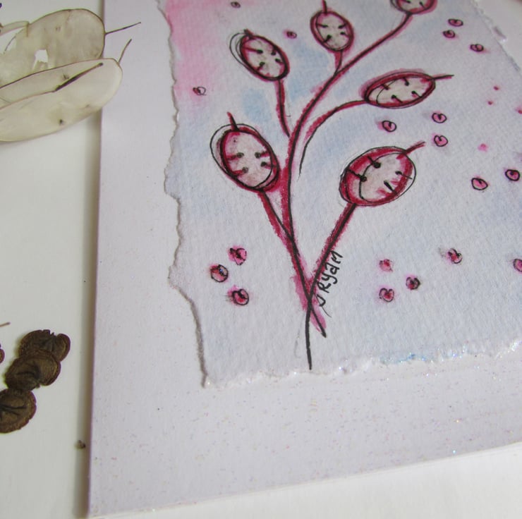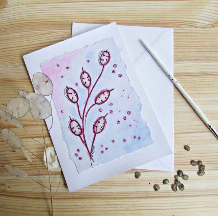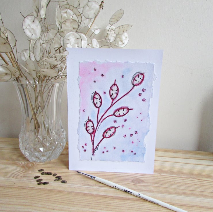 An original watercolour painting of Honesty Seed heads, this is a simple card for any occasion, it has been left blank for your own message, perfect for birthdays, anniversaries, retirement or just to show someone you care.