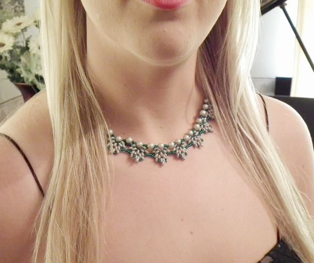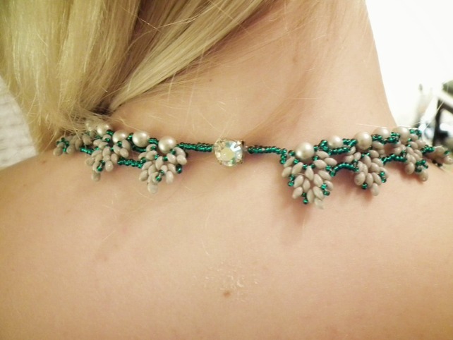 Bespoke pretty leaf design beadwork necklace with glittering Ab Vintage box clasp . I have made this necklace with needle and beaders thread using a technique called beadweaving. This takes time to make, with lots of intricate work.