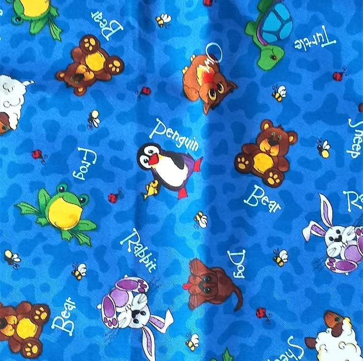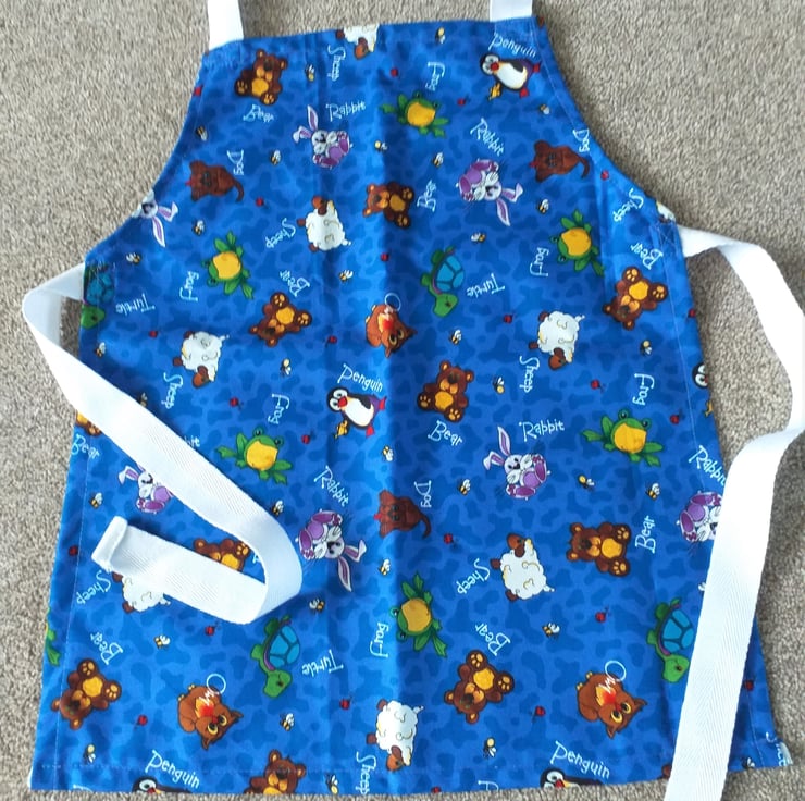 This is a lovely bright blue apron with colourful animals scattered all over it, their names written in white beside them. They include penguins, frogs, sheep, bears, owls, turtles, dogs and rabbits, with tiny bees and ladybirds among them. The pinnie is good quality cotton and the straps are acrylic webbing. It can be machine washed. It measures approximately 17" (43 cms.)from neck to hem, and 14" (36 cms.) at the widest point, and will fit a child from about 2-6 years. The child demonstrating a different apron in the same size is three years old.