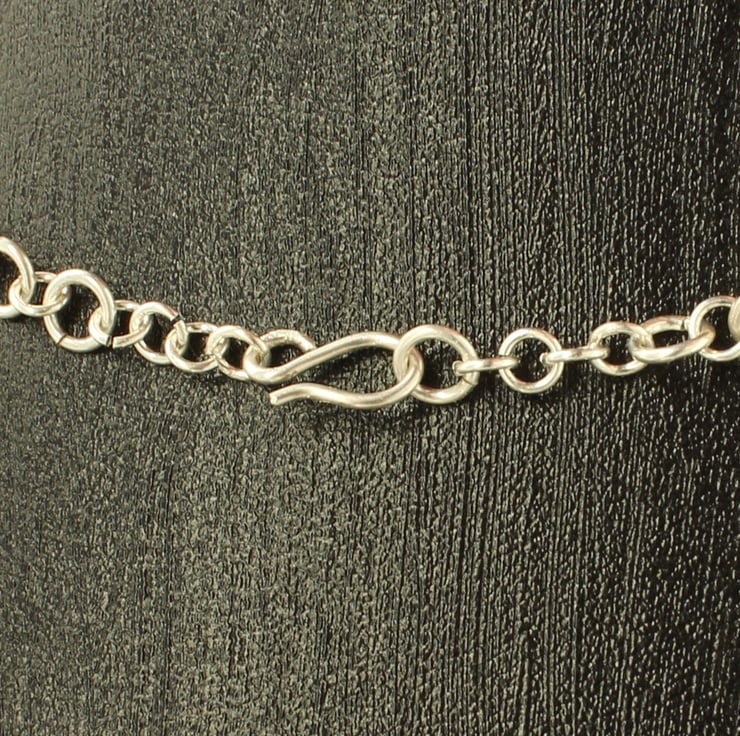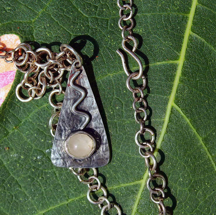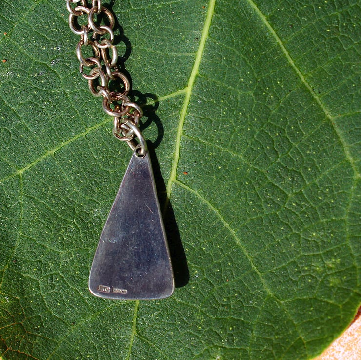 The pendant measures 15mm at the wide end and is 30mm long. The round stone is 5mm across. The chain is a single link sterling silver chain of alternating 5mm and 4mm hoops, it is 45cm (18" ) long and closes with a curled hook.