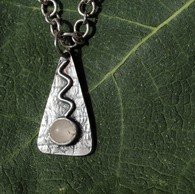 An exciting, modern design of a pendant, unique and original to myself. It features a charming contrast of pale Pink Quartz, a placid stone, framed on a dynamic textured silver triangle with extra silver fused upon it. It gives a noticeable look and the combinations of polished and darkened silvers with delicate pink works well in all lighting conditions.