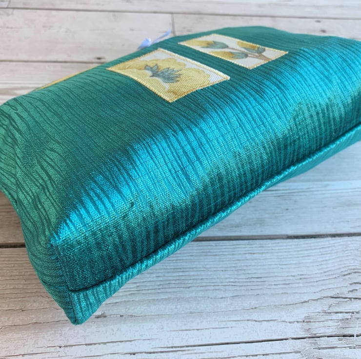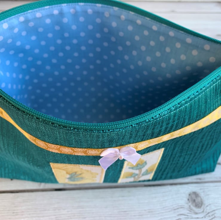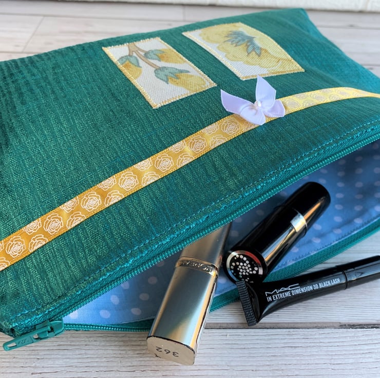 A large sized make up bag in a luxurious turquoise textured fabric with a slight sheen. The cosmetic bag is embellished with two small decorative panels of print fabric featuring golden yellow and turquoise flowers on a white background. I've trimmed the bag with golden yellow satin ribbon with a pattern of little white roses. I've also added a small white satin ribbon bow with a tiny pearl seed bead in the centre. The cosmetic bag has a matching turquoise zip and is lined with pale blue fabric with white polka dots. The base of the bag is boxed giving lots of space inside.